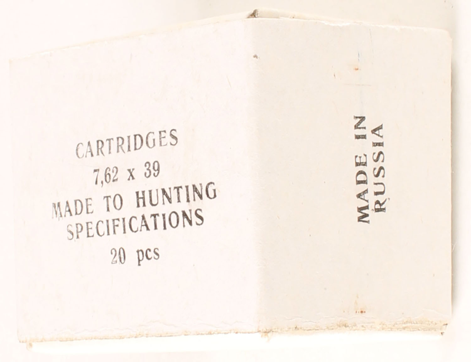 Unknown Russian Mfg., 7,62 x 39, Full, 1pc, white box with black print, box is solid, ammo is excellent. Grade: Excellent - Value: 12 to 18
