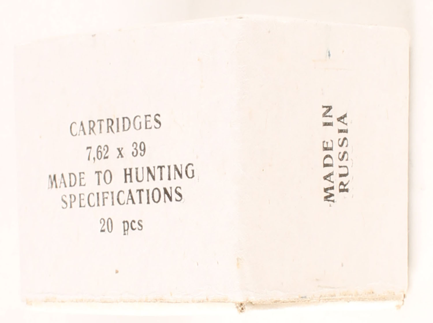 Unknown Russian Mfg., 7,62 x 39, Full, 1pc, white box with black print, box is solid, ammo is excellent. Grade: Excellent - Value: 12 to 18