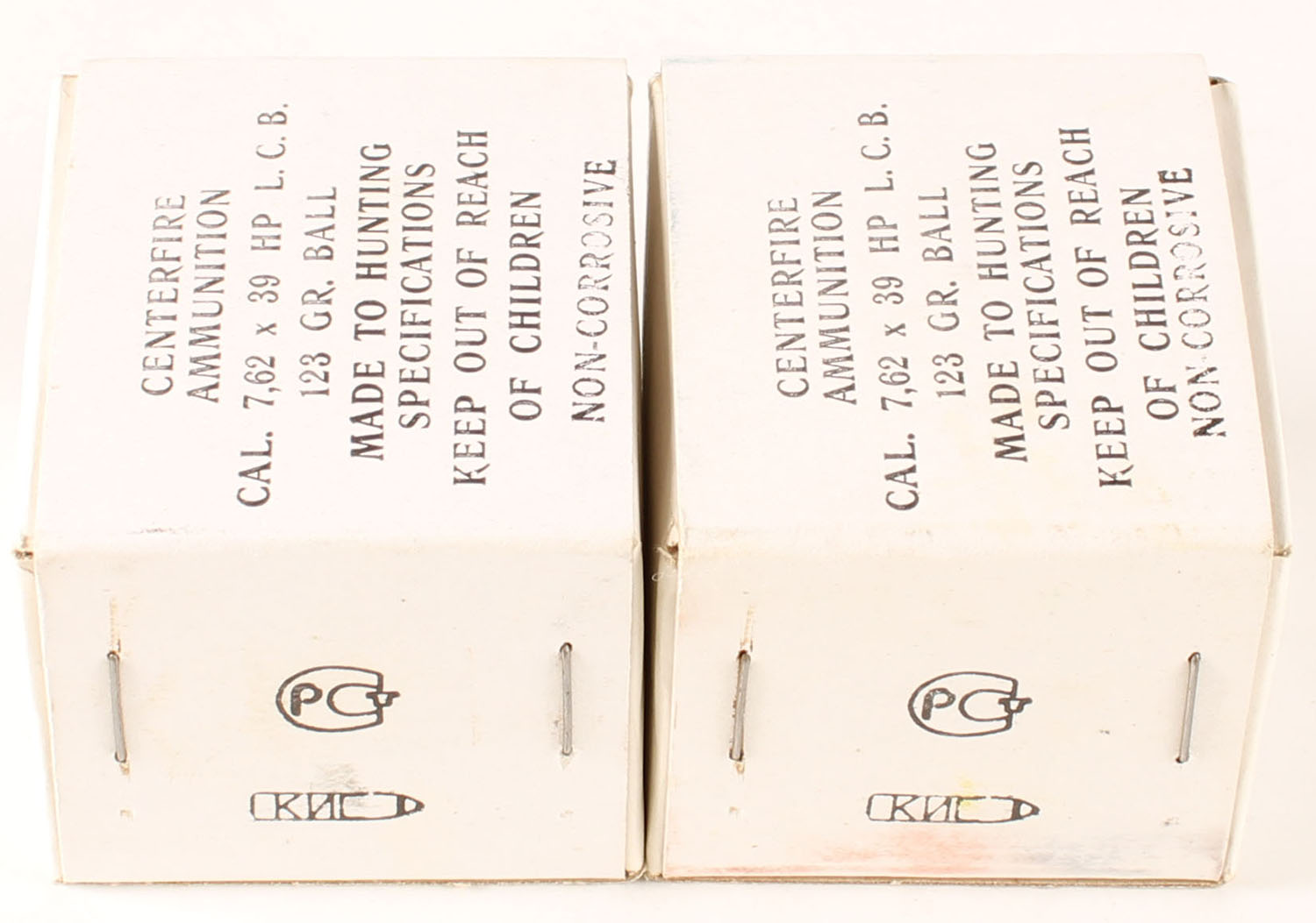 Unknown Russian Mfg., Lot of (2), 7.62 x 39 HP, 123 Grain Ball, Full, 1pc, white boxes with black print, ammo is minty. Grade: Excellent + - Value: 18 to 27