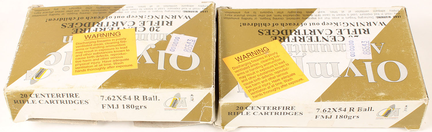Olympic, Lot of (2), 7.62 x 54 R Ball, 180 Grain FMJ, Full, 1pc, White & gold boxes, boxes have light scuffing with edge wear, ammo is excellent. Grade: Good ++ - Value: 24 to 36