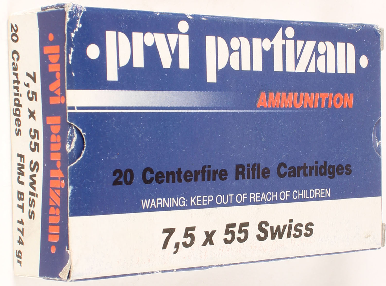 Prvi Partizan, 7,5 x 55 Swiss, 174 Grain FMJ BT, Full, 1pc, Multi-colored box, box is solid, ammo is good. Grade: Very Good - Value: 20 to 30
