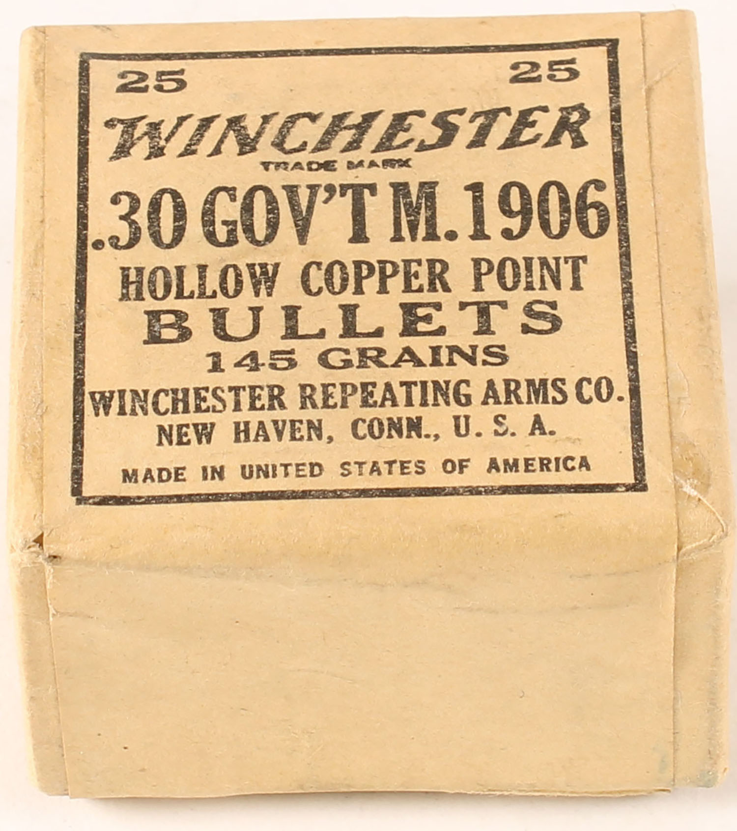 Winchester, .30 Gov't M. 1906, 145 Grains Hollow Copper Point, FULL & SEALED, 2pc, Buff box with buff & black wraparound label, box is very solid, edges are crisp, label is intact. Grade: Excellent ++ - Value: 30 to 45