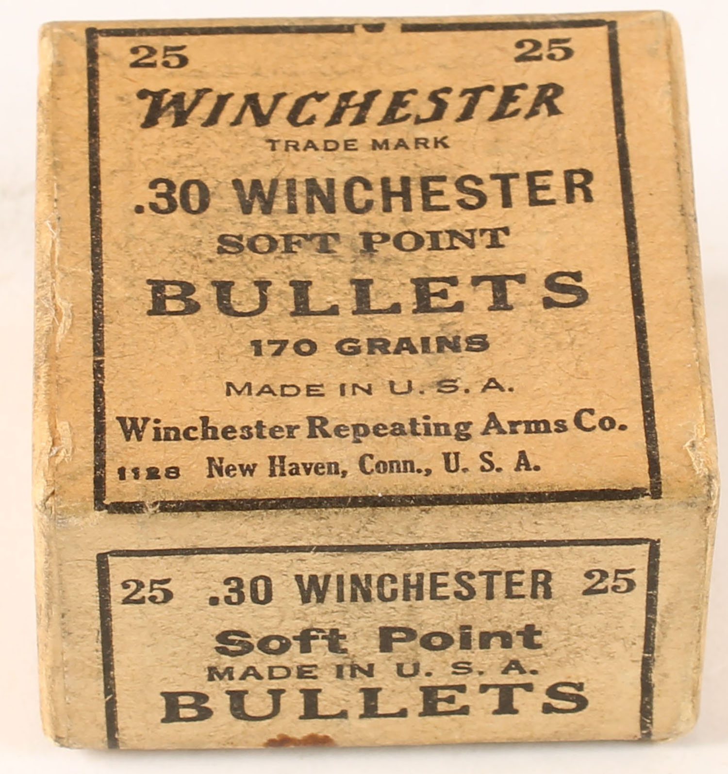 Winchester, .30 Winchester, 170 Grain SP Bullets, Appears half Full, 2pc, Buff box with buff & black label, box is solid, edges are crisp, label is intact, bullets are good. Grade: Very Good - Value: 20 to 30