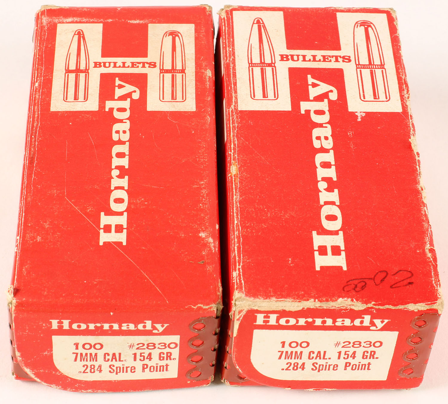 Hornady, Lot of (2), 7mm Cal., 154 Grain, .284 Spire Point, Full, 1pc, boxes are very solid, bullets are excellent. Grade: Very Good ++ - Value: 16 to 24