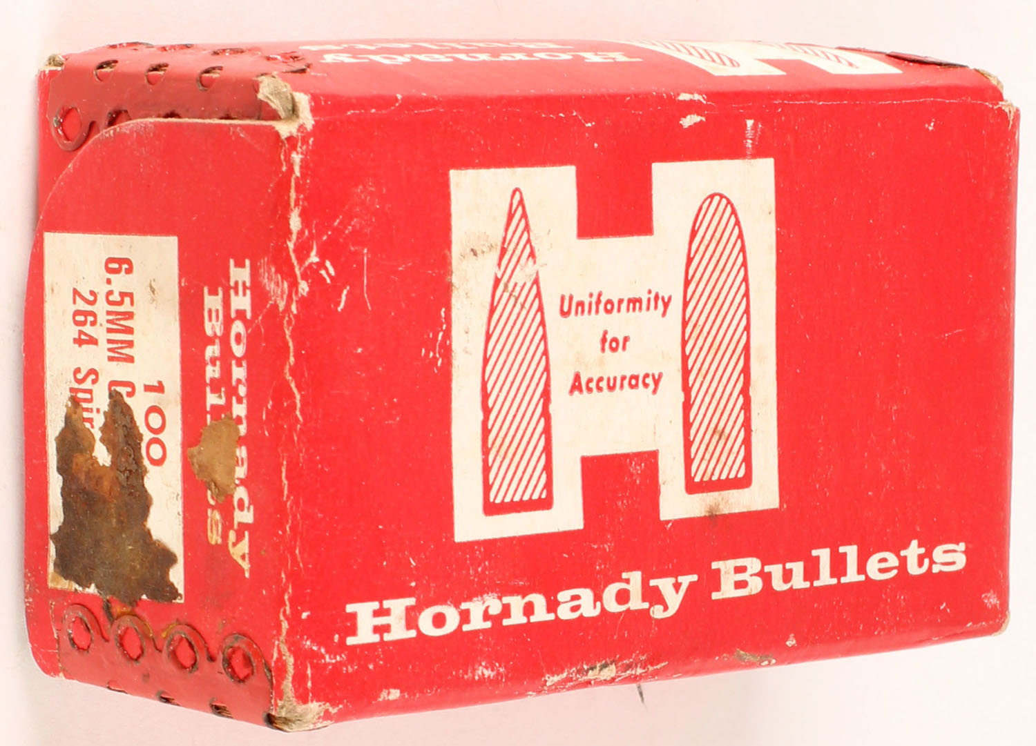 Hornady, 6.5mm Cal., 140 Grain .264 Spire Point, Full, 1pc. Red & white box, box is solid with excellent color, very minor age soiling, corners are mostly sharp, bullets are Very good. Grade: Very Good ++ - Value: 16 to 24