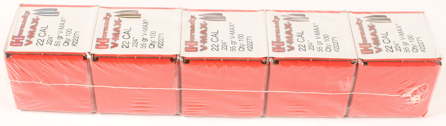 Hornady, Lot of (5), .22 Cal., .224'', 55 Grain V-Max, Full, 1pc. Red & white boxes are very solid. Grade: MINT - Value: 30 to 45