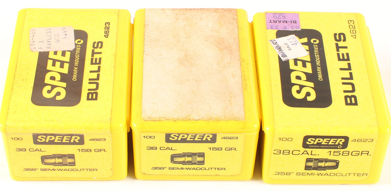 Speer, Lot of (3), .38 Cal., 158 Gr., Semi-Wadcutter, .358'', (2) Full, (1) FULL & SEALED, 1pc, Yellow & black plastic boxes, boxes are very solid, bullets are excellent. Grade: Excellent - Value: 24 to 36