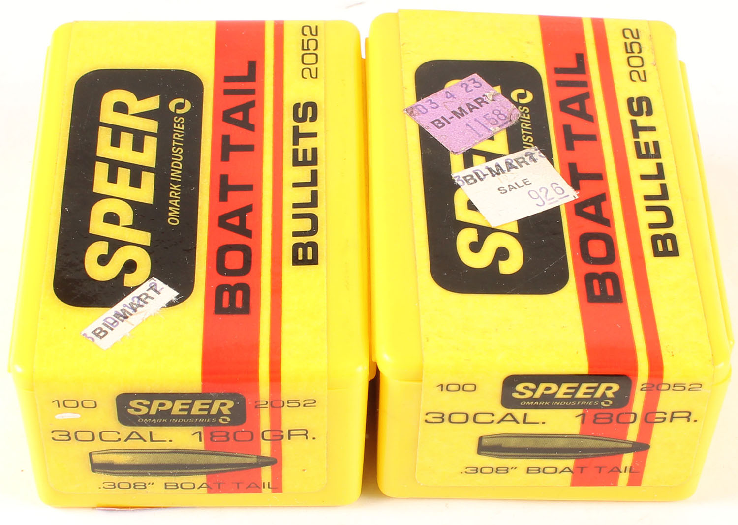 Speer, Lot of (2), .30 Cal., 180 Grain, .308'' BT, FULL & SEALED, Multi-colored boxes, boxes are very solid. Grade: Excellent ++ - Value: 24 to 36