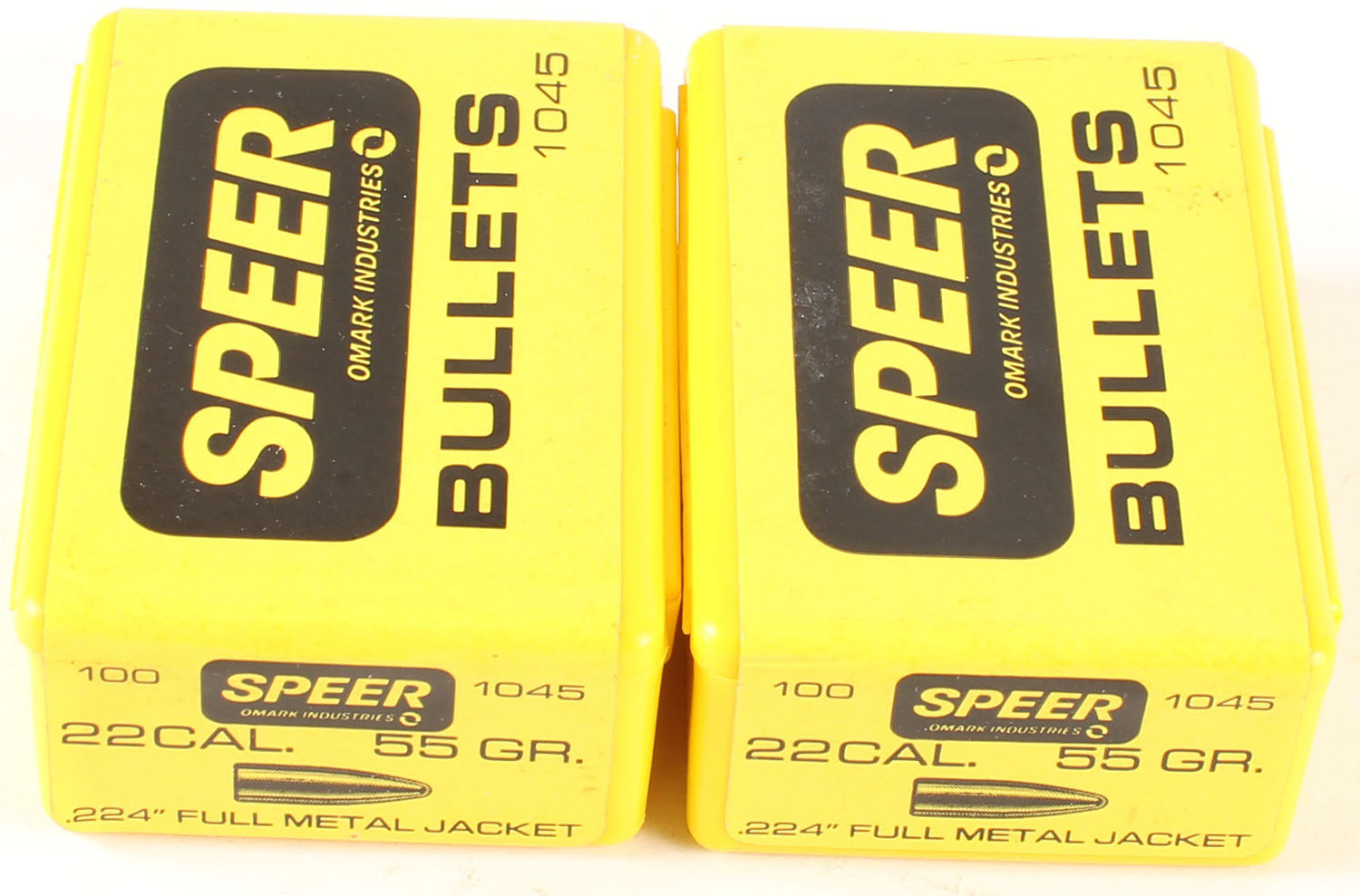 Speer, Lot of (2), .22 Cal., 55 Grain, .224'' FMJ, FULL & SEALED, Multi-colored boxes, boxes are very solid. Grade: Excellent ++ - Value: 24 to 36