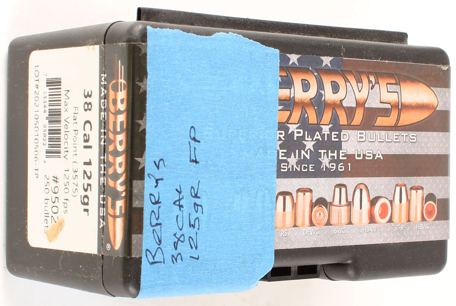 Berry's, Superior Plated Bullets, 38 Cal.(.3575), 125 Grain Flat Point, Appears Partial (3/4 Full), 1pc, Black plastic box, box is minty. Grade: Excellent ++ - Value: 16 to 24