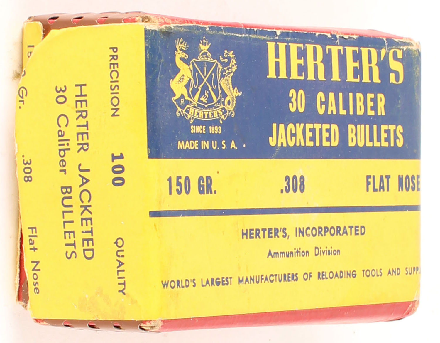 Herter's, 30 Caliber Jacketed Bullets, 150 Gr., .308 FN, Appears Partial (3/4 Full), 1pc, Red box with multi-colored label, box is solid, bullets are excellent. Grade: Very Good ++ - Value: 10 to 15