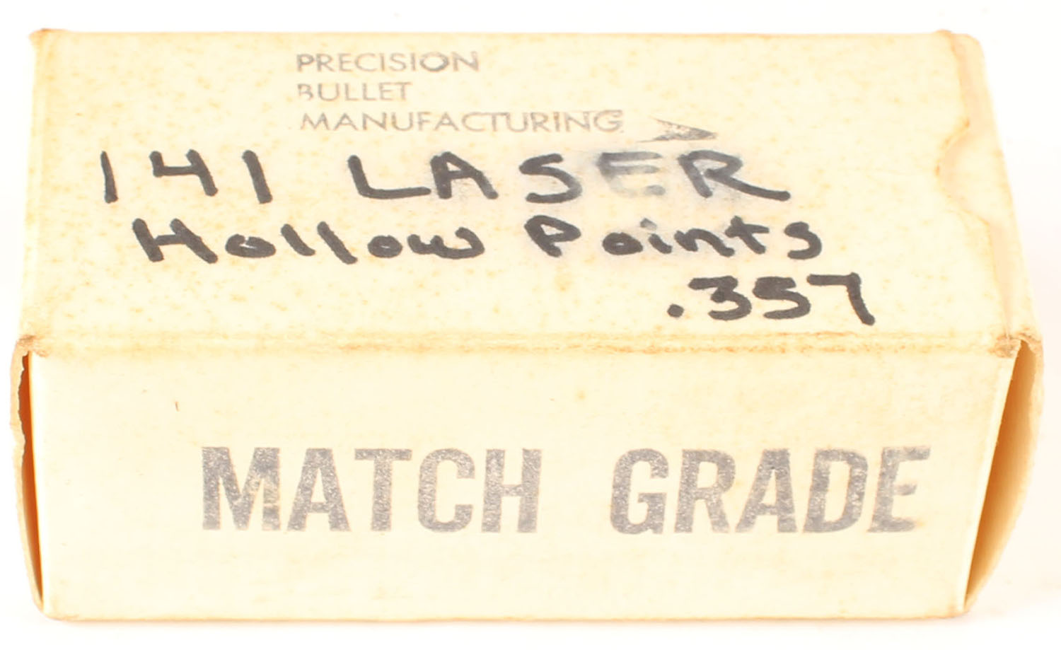Precision Bullet Manufacturing, 141 Laser, .357'' HP, Match Grade, Full, 1pc, White box, box is very solid, bullets are very good. Grade: Very Good - Value: 16 to 24