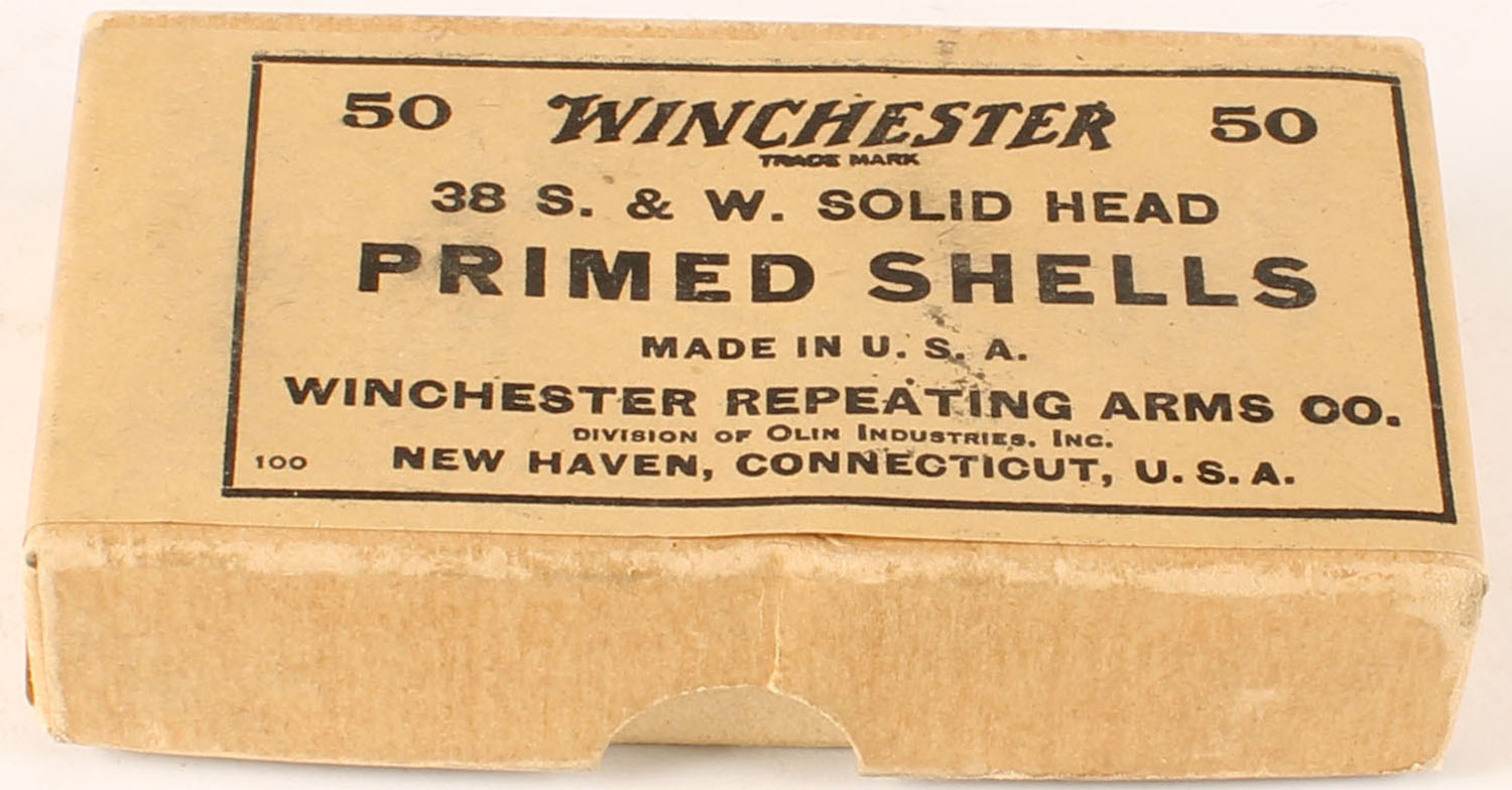 Winchester, Primed Shells, .38 Smith & Wesson, solid head, 2pc, FULL & SEALED, buff box with buff & black top label, sides have no lettering, near mint condition, very solid & crisp edges. Grade: Excellent + - Value: 20 to 30