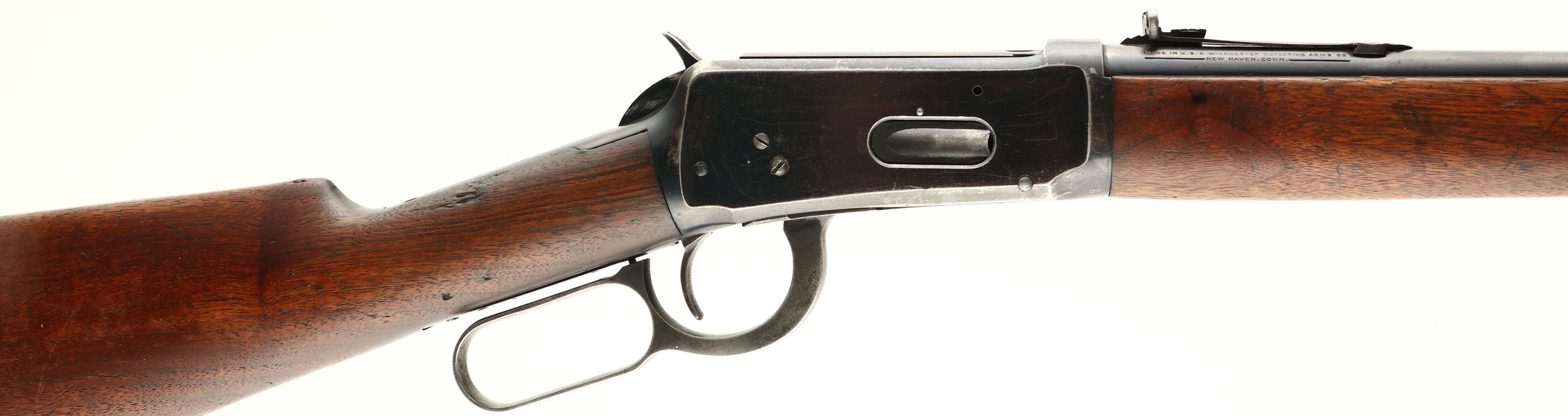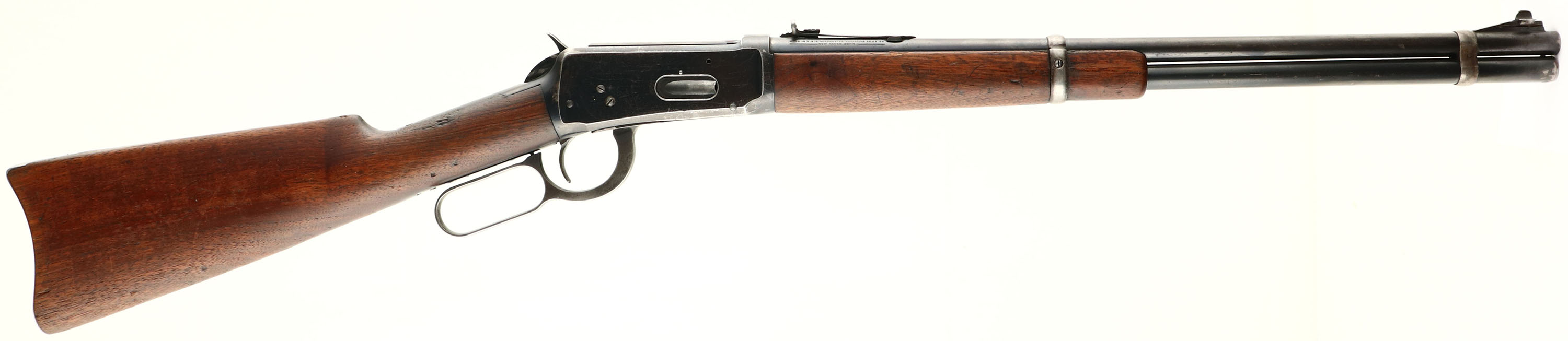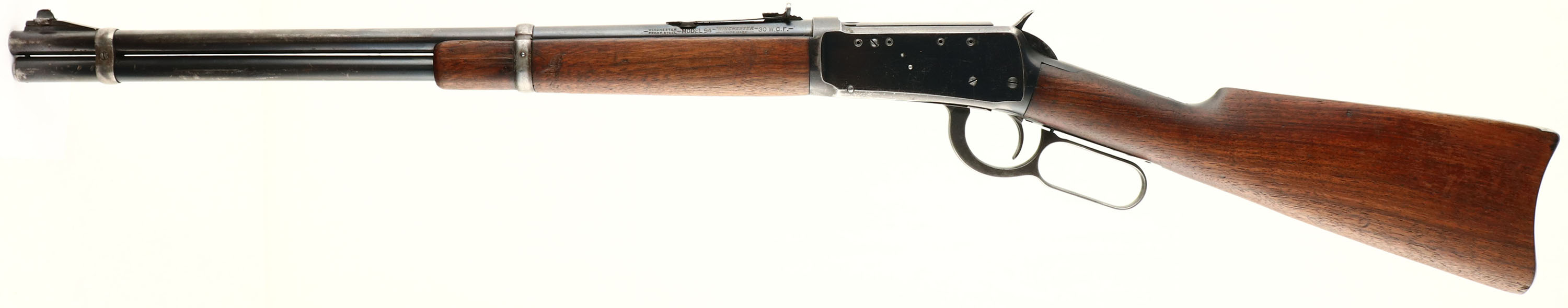 Winchester, Model 94 Eastern Carbine, marked 30 W.C.F. (30-30) Cal., MFG: 1937, SN: 1119710, Lever Action Carbine, 20'' Round barrel, Full mag., The original wood stocks are very good & solid. They several small scrapes, scratches & contusions to the thinned original finish. There is also a couple of larger gouges. The original factory blue finish rates 70% overall. Bore is excellent. The receiver carries four screw filled holes on the left of the receiver from a previous scope mounting. The barrel holds an adjustable rear & blade front sights. Carbine smooth metal buttplate. Tight smooth action. An original & very good overall example of a 94 carbine. FFL & C&R Req. - Value: 500 to 1000