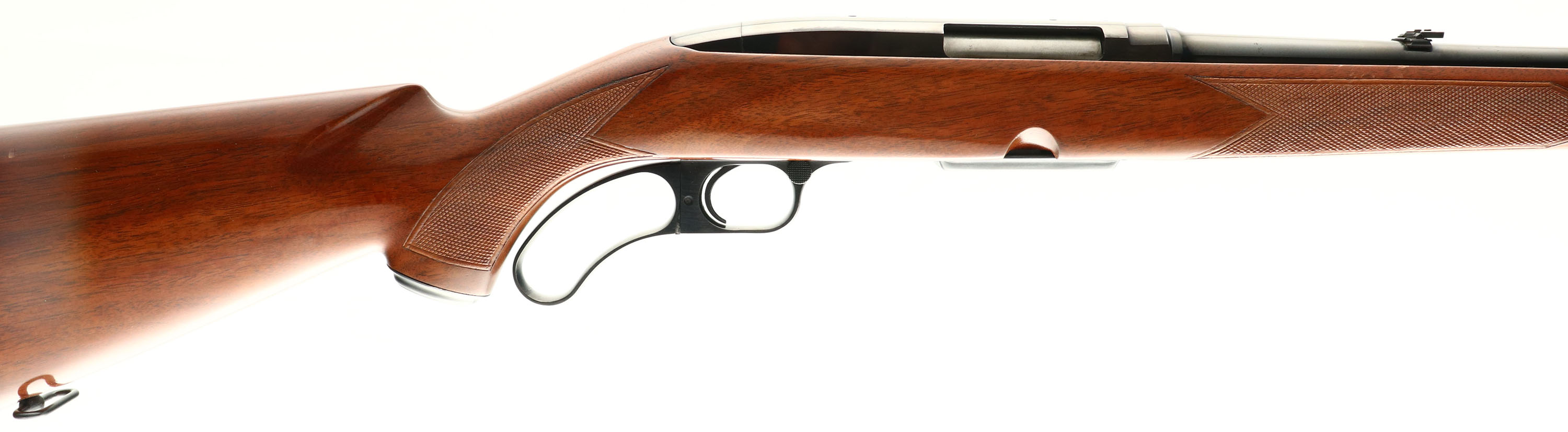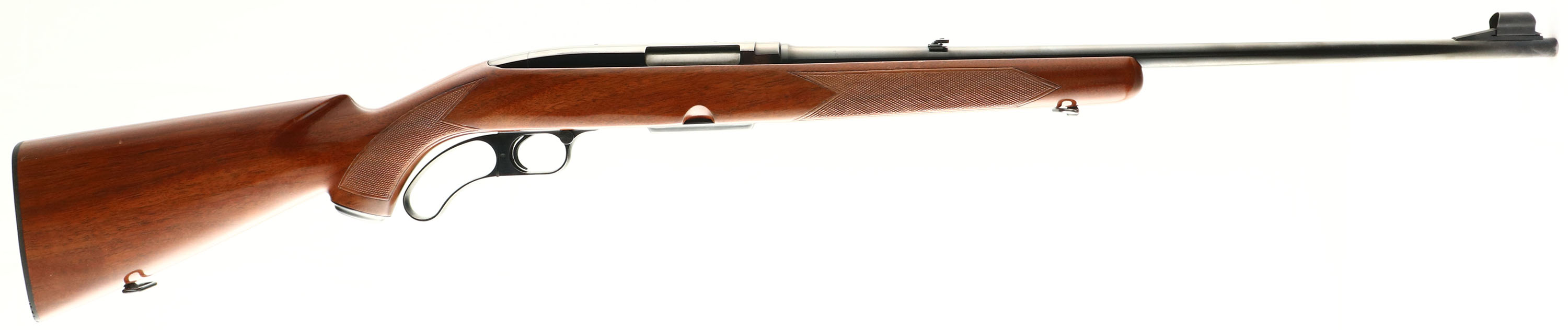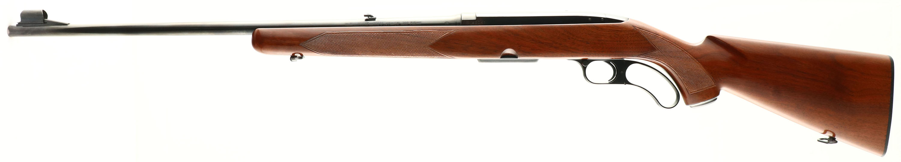 Winchester Model 88, CAL: 308 WIN, MFG: 1957, SN: 42041, Lever Action Rifle, 22'' barrel. Pre-64. The original checkered & capped pistol grip wood stock is excellent, having been professionally refinished. The stock had a very thin hairline crack on the left side running from the back of the trigger guard & running diagnally to the top edge mid receiver. It was professionally repaired before the stock refinishing & almost goes unnoticed unless you know its there. The original checkering remains excellent & there are almost no handling marks to the excellent finish. The original metal blue finish rates 95% overall. Bore is excellent. The barrel holds the original flip-up rear sight & a hooded ramp front sight. Stock carries a black checkered plastic buttplate. Factory sling swivels. There is a an eight digit # lightly electric penciled onto the bottom of the trigger guard. Appearance is excellent overall & would be an excellent shooter. FFL or C&R Req - Value: 800 to 1500