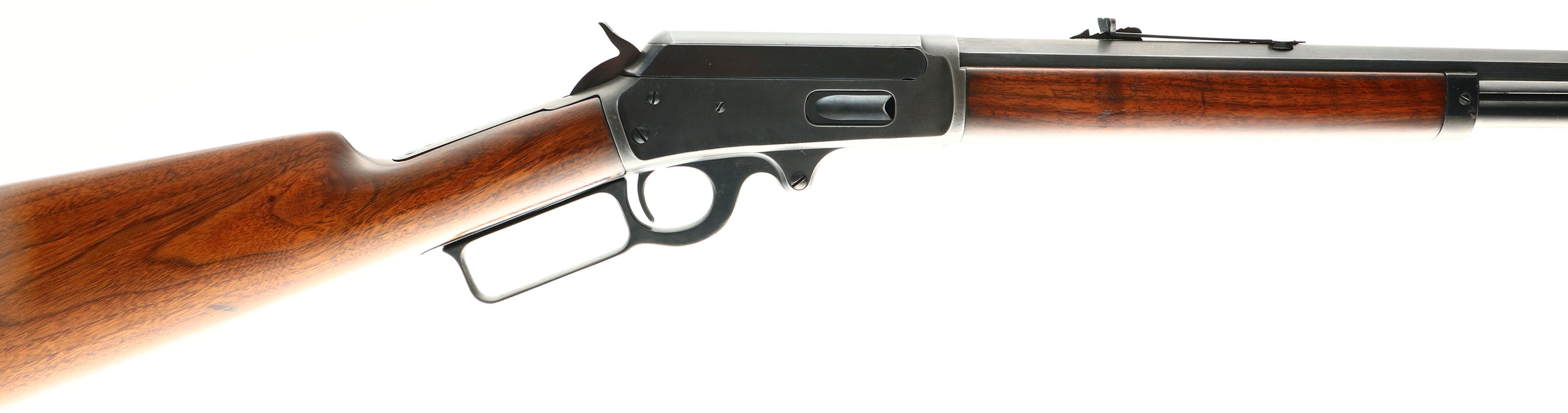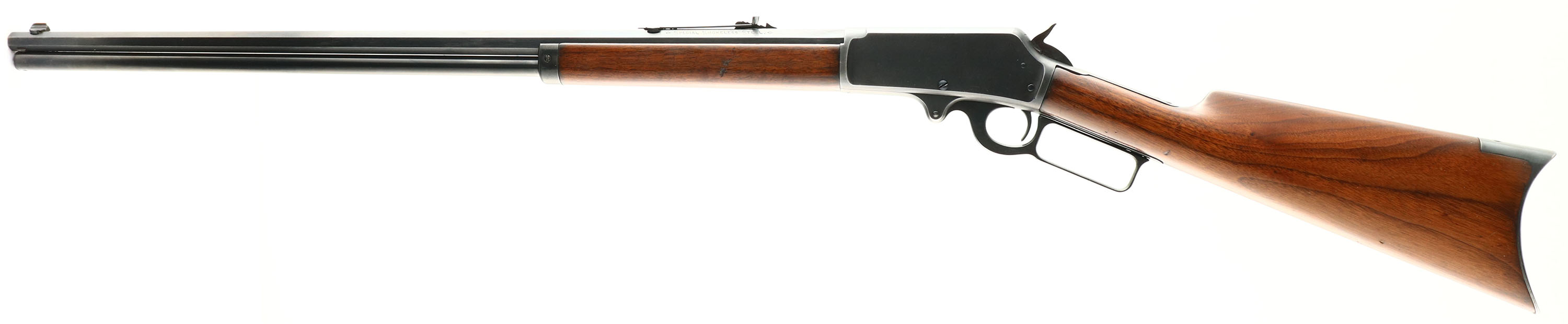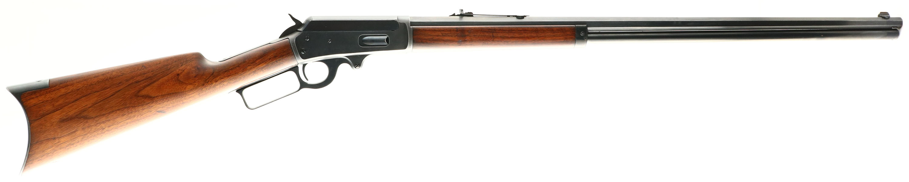 Marlin, Model 1893, .38-55 Cal. MFG. 1899, SN: 191825, Lever Action Rifle, 28'' Octagon barrel, Full mag. The original wood stocks are very good & solid, having been sanded & nicely refinished. There is some wood loss due to sanding, as the metal is proud to the wood in most areas. There are the remains of several small handling marks or contusions. The metal has an older professionally reblue, with full coverage of a thinning blue/gray finish with 90% coverage. Bore is good, but with some cleaned roughness & scarring amongst strong rifling. The barrel carries an adjustable rear & a tall blade front sights. Stock carries a crescent metal buttplate. Tight smooth action. A sharp appearance on this old lever. FFL or C&R Req. - Value: 600 to 1200
