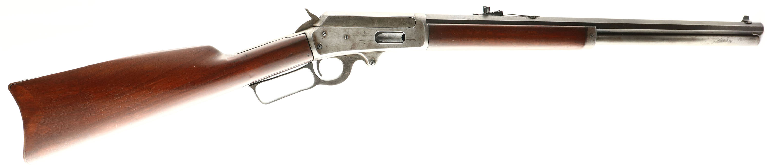 Marlin, Model 1893 Short Rifle (Carbine), marked 30-30 Cal., MFG. 1901, SN: 222399, Lever Action Rifle, 20'' Octagon barrel, Marked ''SPECIAL SMOKELESS STEEL''. Full mag. The wood stocks are good & solid, but the stock is a combination of two stocks with the back 3'' of the buttend having been added to stock to restore the original look & length, which was likely cut short at one time. The stocks were then sanded & refinished, with few minor scrapes, scratches & contusions remaining. The metal surfaces has worn mostly gun metal gray, with thin remnants of orginal blue remaining in the more protected areas of the barrel. Barrel carries an updated Marbles adjustable rear sight & tall blade front sight. Bore is good, but with roughness amongst strong rifling. The stock carries the original carbine style metal buttplate. The lever has some bend & denting to its shape. Action remains tight & smooth. This would make a fun to shoot or hunt with short rifle. FFL or C&R Req. - Value: 400 to 800
