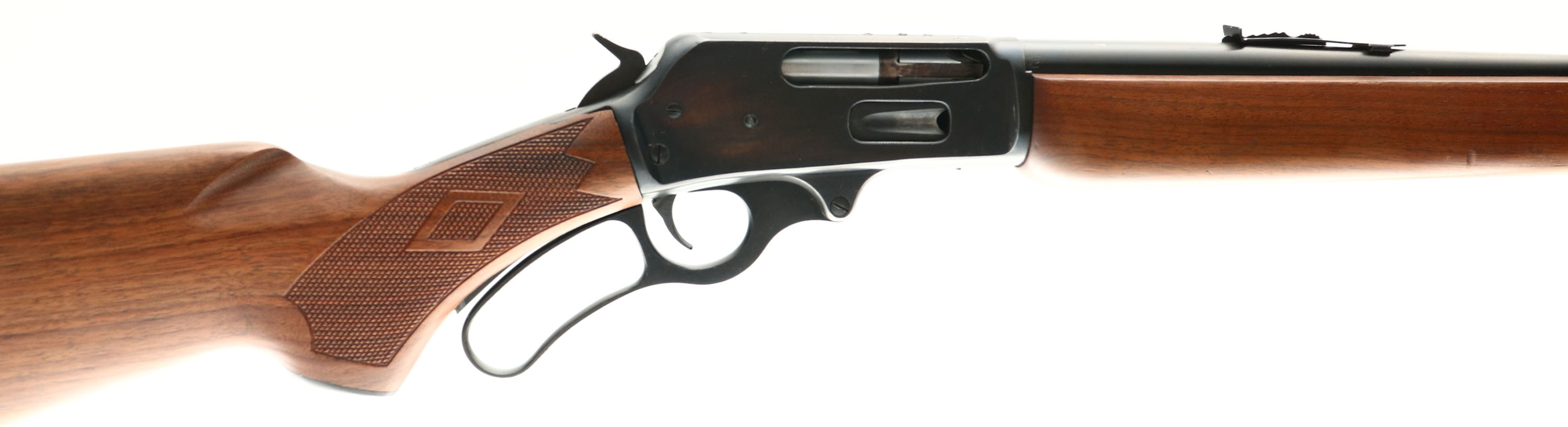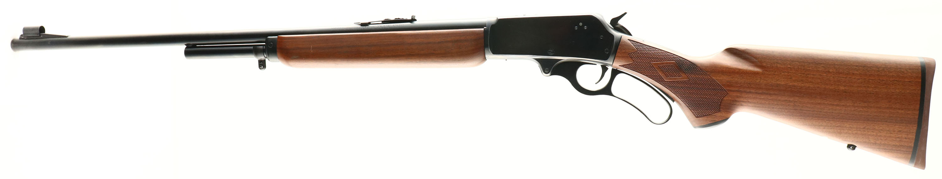 Marlin, Model 336A, CAL: 35 Rem, MFG:1979, SN: H21929, Lever Action Rifle, 23 3/4'' round barrel, 2/3rds mag. The checkered & capped pistol grip wood stock appears to be an updated factory replacement, which is excellent, with no handling marks to the original finish. The forearm appears to be the original smooth grip, which is excellent, with several small contusions to the excellent original finish. The metal blue finish rates 90% overall. The top of the receiver has five modern screw filled holes for potential scope mount. The barrel carries an adjustable rear & ramp elevated hooded blade front sights. Bore is excellent, with strong rifling. Stock carries the original Marlin solid rubber recoil pad. Factory trademark bullseye in belly of the stock. Sling studs. A solid lever action hunting rifle. FFL Req. - Value: 400 to 800