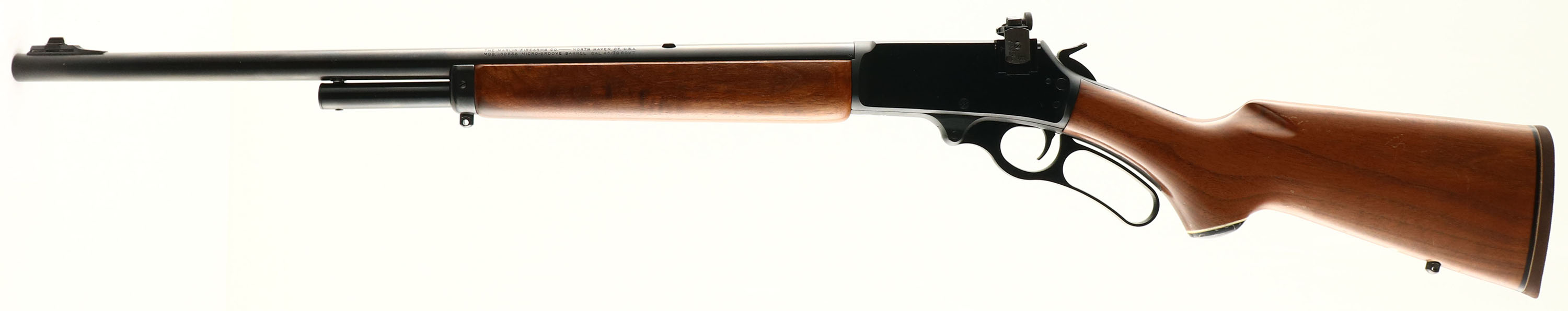 Marlin, Model 1895SS, CAL: .45-70 Gov'T, MFG: Modern, SN: 11010982, Lever Action Rifle, 21 7/8'' round barrel, 2/3rd mag. Post 1984 crossbolt safety MFG. The original smooth capped pistol grip wood stocks are excellent, with a few minor scratches or contusions to the excellent original finish. The original metal blue finish rates 98% overall. The receiver carries a Lyman side mounted adjustable sight, while the barrel carries a blank filled rear dovetail & ramp elevated blade front sight. Bore is excellent & bright. Stock carries the original Marlin solid rubber buttplate. Factory trademark bullseye in belly of the stock. Sling studs. An original & overall excellent rifle. FFL Req. - Value: 800 to 1200