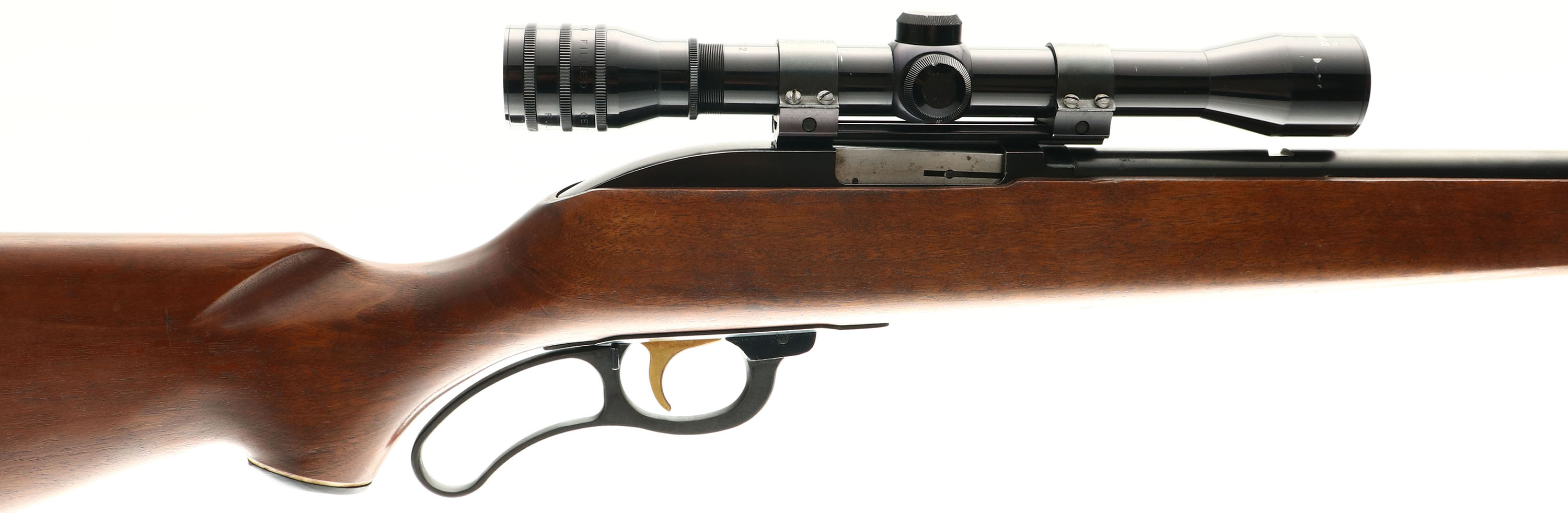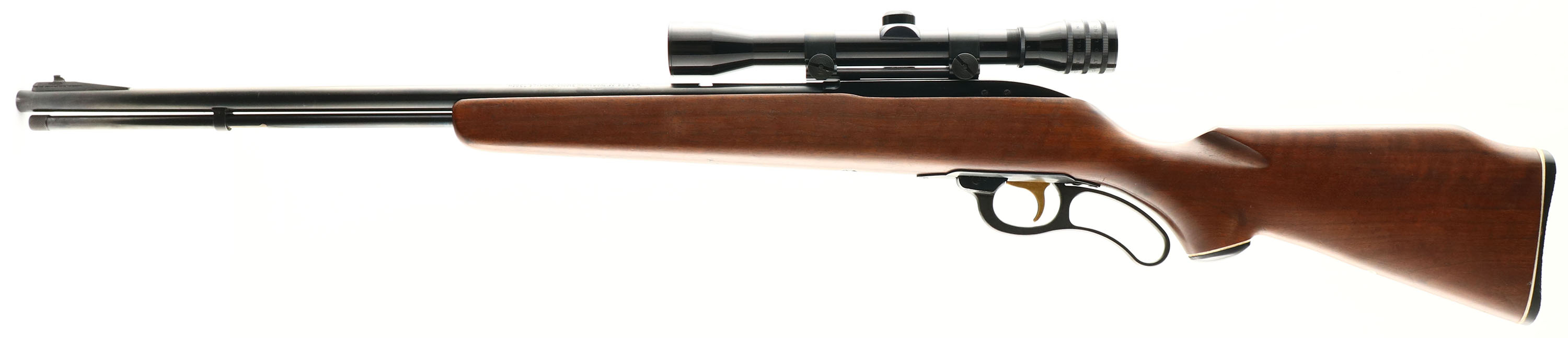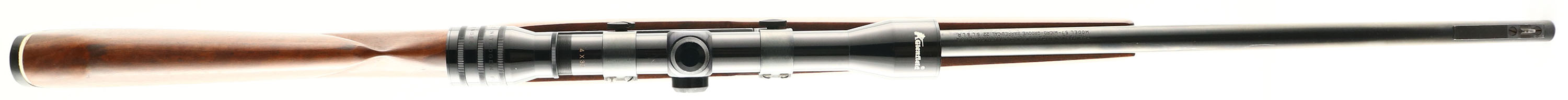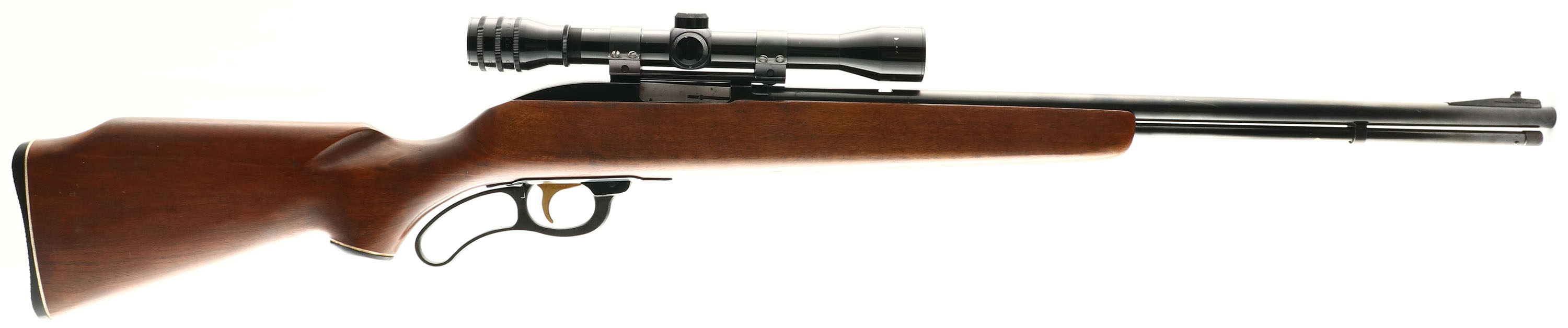 Marlin, Model 57 ''Levermatic'', CAL: 22 S.L.LR., MFG: 1966-68, SN: NSN, Lever Action Rifle, 24'' barrel. The whiteline capped pistol grip Monte Carlo wood stock is excellent & solid, with very few light use marks to the excellent original finish. The metal blue finish rates 97% overall. Bore is excellent & bright, with the Micro-Groove rifling. The receiver holds a Glenfield 4X32 scope mounted on a rail, with Herter's rings. The barrel has an open rear dovetail & ramp elevated small blade front sight. Stock carries a Marlin checkered & whiteline black plastic buttplate. Gold wash trigger. Has trademark bullseye in belly of stock. An excellent original example. FFL or C&R Req. - Value: 300 to 600