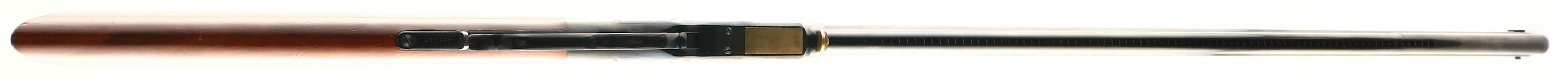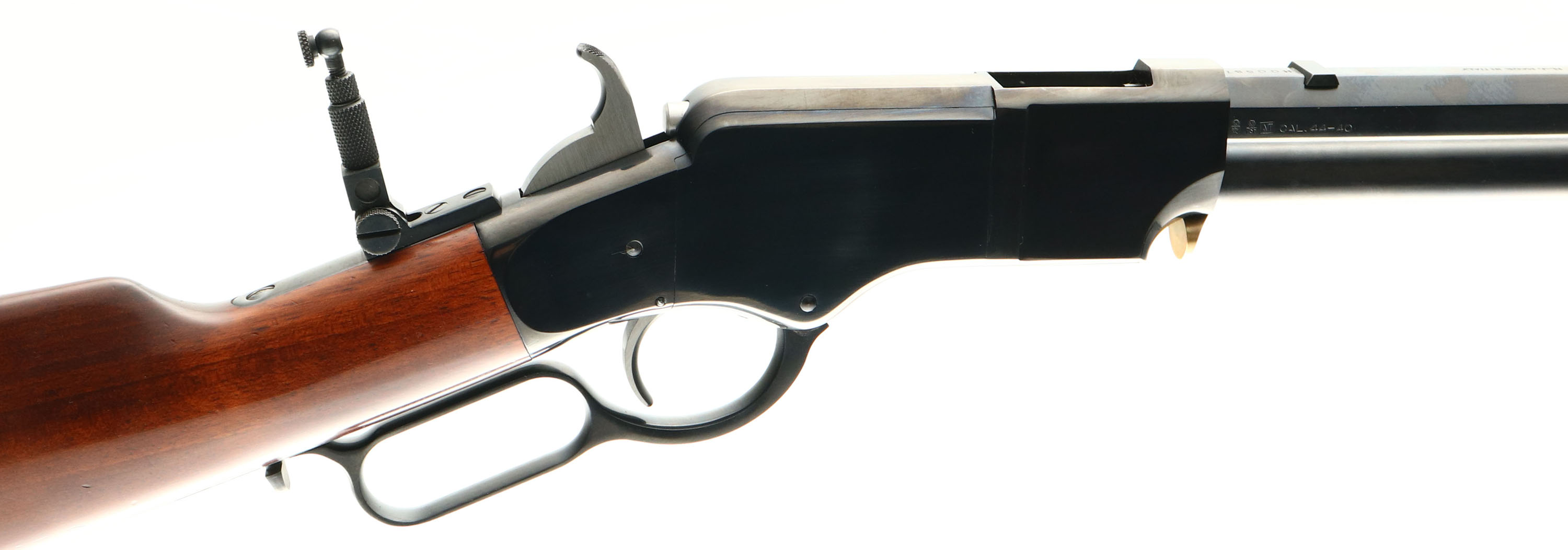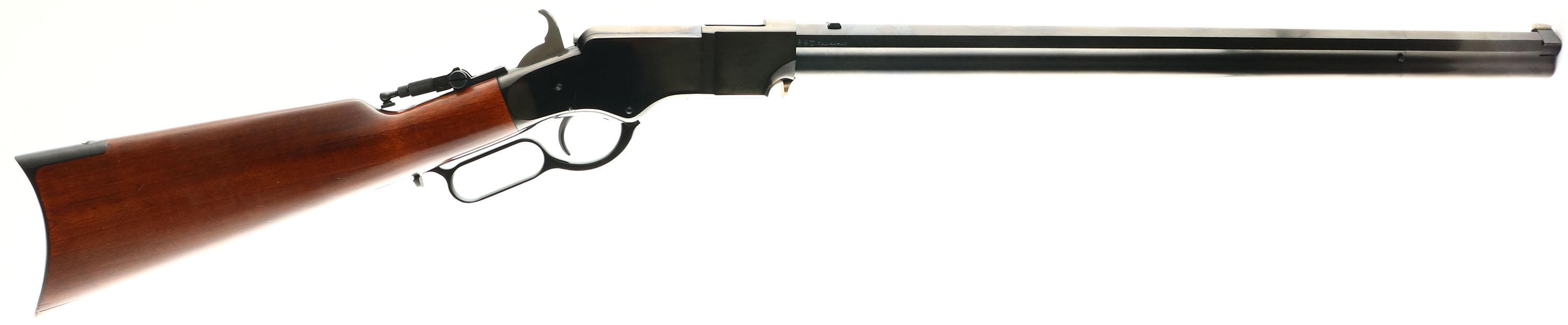 Uberti, Model 1860 Henry Rifle, STEEL Frame, CAL: 44-40, MFG: Modern, SN: H00687, Lever Action Rifle, 24 1/4'' Octagon barrel. Navy Arms Co. importer. The original straight grip wood stock is excellent, displaying minor handling marks the original finish. There is 1 1/4'' stress cracks at each side of the toe & a tiny edge chip. The high polished blue finish on the receiver, barrel & tube is 99%, excellent. Bore is excellent, near mint. The receiver is fitted with a flip-up tang sight, while the barrel holds a blank filed rear dvetail & silver blade front sight. Stock carries a crescent metal buttplate. A fine reproduction of the antique original. FFL Req. - Value: 1000 to 1700