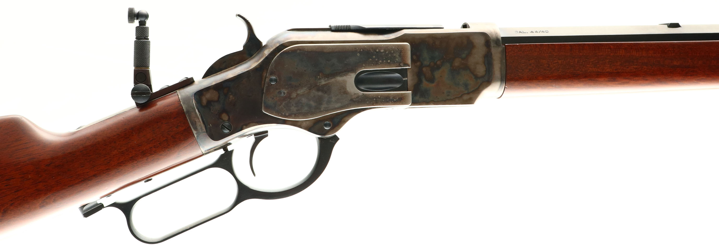 Uberti, Model 1873 Rifle, CAL: 44-40, MFG: Modern, SN: 53282, Lever Action Rifle, 24'' Octagon barrel. The original straight grip wood stocks are excellent, displaying very few minor handling marks the excellent original finish. The high polished blue finish on the barrel & tube rates excellent 99%. The receiver displays vivid case-colors. Bore is excellent, near mint. The receiver is fitted with a flip-up tang sight, while the barrel holds a blank filed rear dvetail & small blade front sight. Stock carries a crescent metal buttplate. A fantastic reproduction of an American classic. FFL Req. - Value: 1000 to 1800