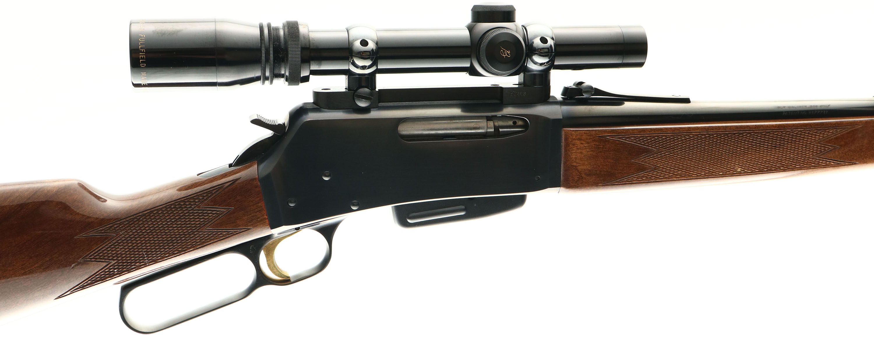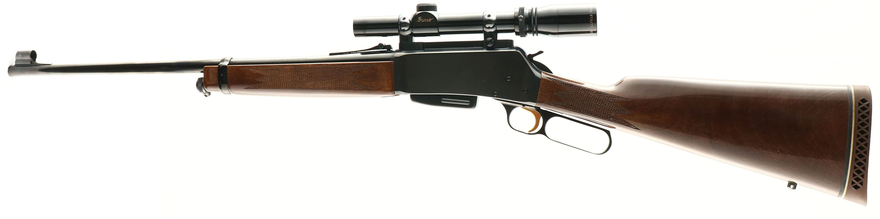 Boxed Browning, Model BLR 81 Lightweight, .358 Only Cal., MFG. 1980, SN: 30212PM127, Lever Action Rifle, 20'' round barrel, Detachable 4 round box mag. Original factory checkered straight grip wood stocks are excellent, with light use wear to the excellent original finish. The original metal blue finish on the barrel & receiver rates 99%. Bore is excellent. The receiver is mounted with a period Burris Fullfield 1 3/4X-5X scope, while the barrel carries the original factory rear & front sights. The stock carries the original Browning ventilated recoil pad. Gold Trigger. Sling studs. Rifle comes with the correct SN matching box, with packaging & booklet. An overall excellent Browning lever. FFL Req - Value: 800 to 1200