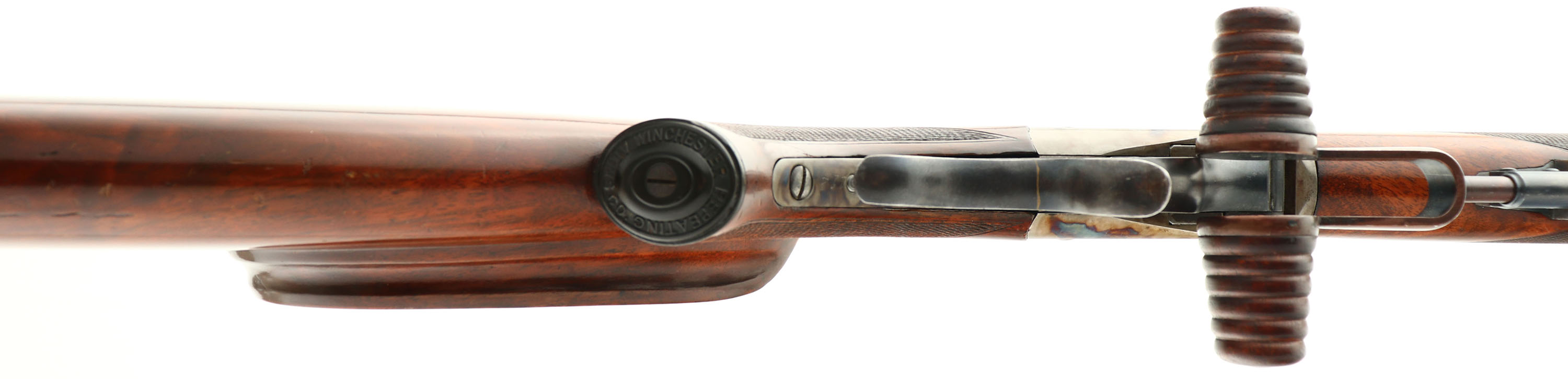 Winchester, Model 1885 Schuetzen Rifle, .32-40 Cal., MFG. 1896, SN: 75112, Lever Action Single Shot Rifle, 29 1/2'' Full Octagon #4 Heavy barrel. This Rifle presents as a custom built replica of the factory special order Deluxe Schuetzen rifle. According to the Cody Museum Winchester Factory Records SN 75112 started life as a standard rifle in 32 WCF, with a 28'' #1 weight barrel. The rifle has since been customized & carries a number of features consistent with the deluxe Schuetzen models. It carries a XX 1st style Swiss cheeked stock, with a steep rise top comb, deluxe checkering, capped pistol grip & a nickeled Swiss Schuetzen buttplate. The Schnabel style forearm has an ebony inlay in the tip, deluxe checkering & a folding palm rest. Both stocks display fantastic grain & the majority of the high gloss finish. The are a handful scuffs & light handling marks as well as a small repair to the cheek edge & a 6'' thin finish level scratch on the right side of the stock. The metal blued finish on barrel rates at 95%, while the case-hardened receiver displays fantastic case colors, The lever has had the spur very nicely added to an original 1885 lever that has also been reshaped. The rifle carries double set triggers which work correctly. The bore rates excellent. Barrel is mounted with a 16'' Winchester A5 scope on Winchester mounts, a blank filled rear dovetail & silhouette front sight. The barrel is marked ''32-40'' on top of barrel flat & under forearm. The barrel is also marked with a ''4'' for barrel weight ahead of forearm & under forearm. It is also stamped with the assembly # ''6159'' under the forend. The side of left tang of the receiver is marked with ''XX'' & ''6159''. The buttplate is also stamped ''6159'', as is the buttstock on the buttend & upper channel. This rifle has a wonderful appearance & remains highly collectible as presented as a deluxe Schuetzen 1885 rifle. Antique, No FFL Req. - Value: 3000 to 6000