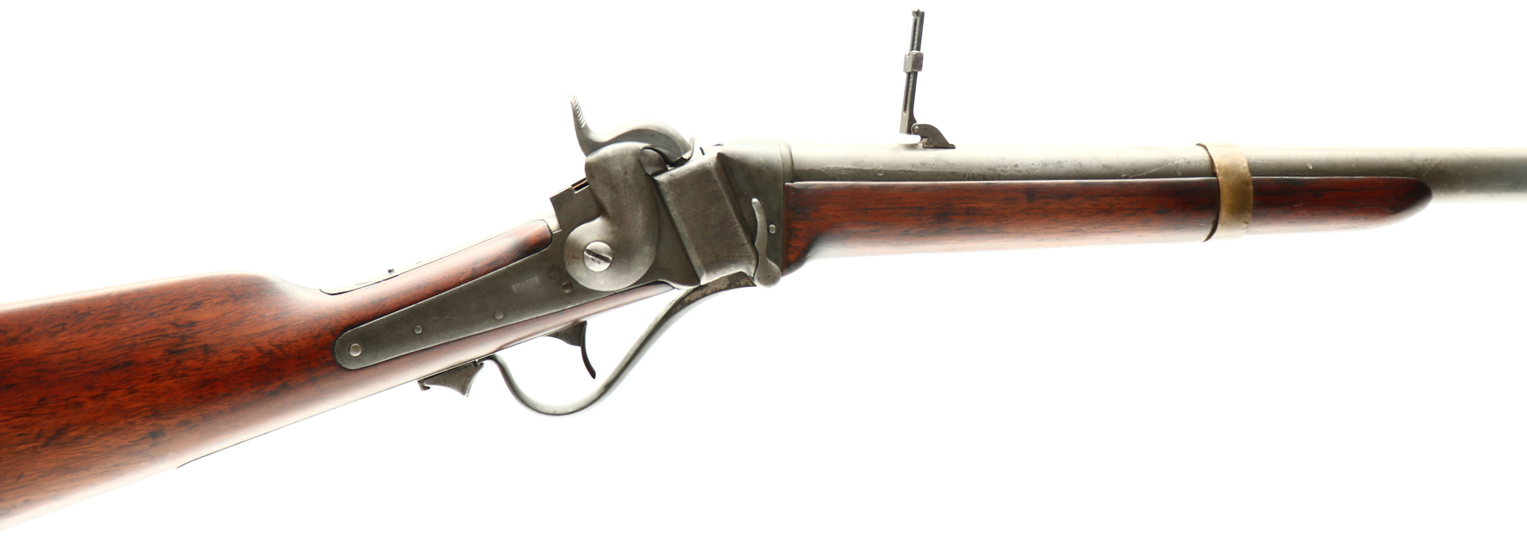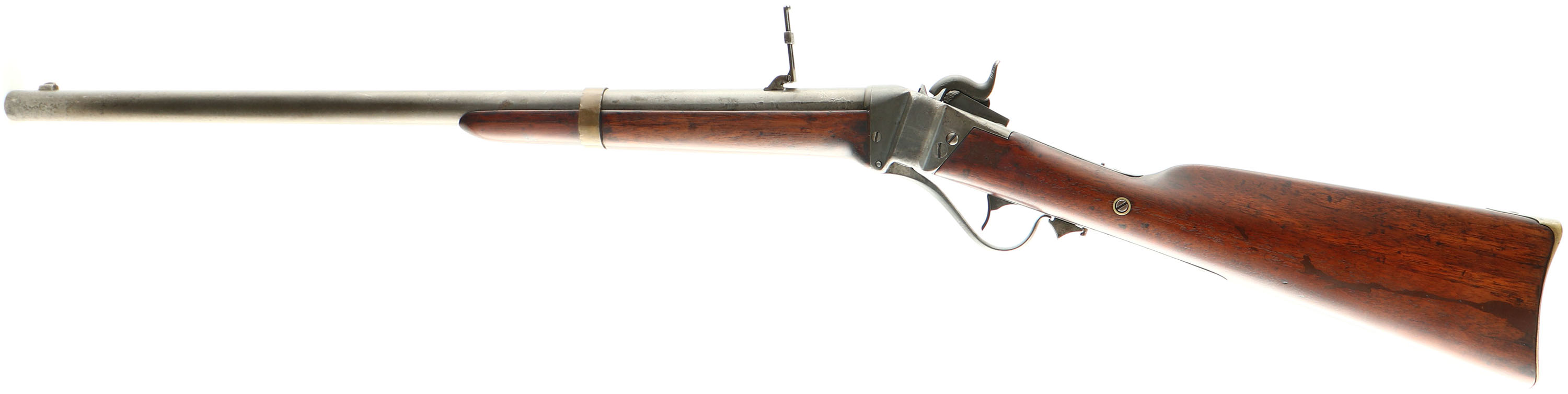 RARE Sharps, Model 1853 Slant Breech Carbine, 52 Cal , MFG 1853-55 Antique, SN 21330, Lever Action, 25'' Round barrel. The Sharps Model 1853, sometime referred to as the Slant Breech or Sloping Breech, was an improvement on earlier carbines. Roughly 10,500 Model 1853 carbines were produced between 1853 & 1858. The top of the barrel is stamped ''SHARPS RIFLE MANUFG CO. HARTFORD. CONN.'' forward of the rear sight. Matching serial number on the barrel under the forearm & top tang. The left side of the receiver is marked with the two line ''SHARPS PATENT'' stamp. The top of the receiver ahead of the SN is a worn ''SHARPS PATENT 1848'' The original wood is good & solid, but has been sanded & refinished, with several areas of fill & evidence of the numerous chips, nicks & dings remaining. The stock carries a hinged patch box & brass carbine buttplate. The rifle's metal surfaces have fully worn a gun metal gray. The barrel is fitted with the forward folding ladder rear sight & standard front sight. Bore is very good, with some roughness amongst strong rifleing. This is a rare example of a Sharps SLANT Breech in complete surviving condition. Antique No FFL Req - Value: 2000 to 4000