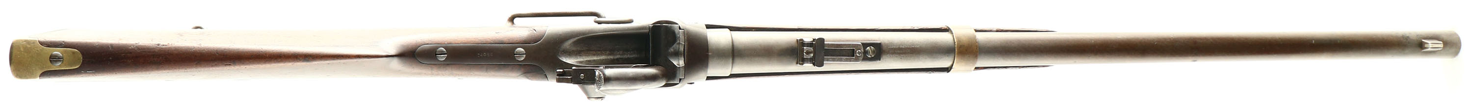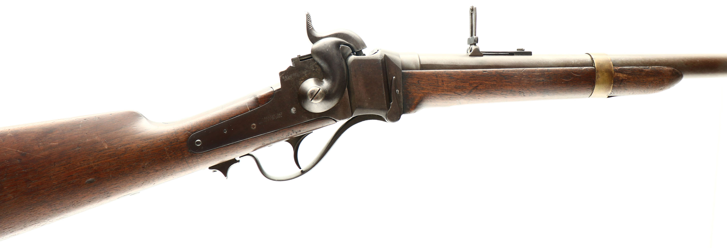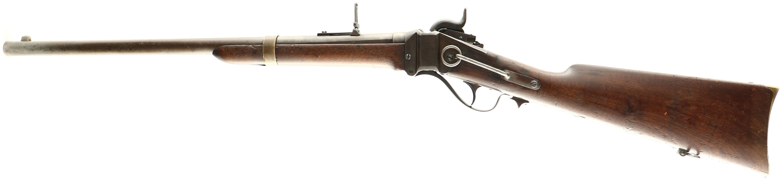 Sharps, Model New Model 1859 Carbine, .52 Cal., MFG. Antique, SN: 32071, Lever Action falling block, 22'' Round barrel, A Civil War Sharps Saddle Ring Carbine. Approximately 27,000 New Model 1859 were produced, with this rifle being an early production example as it still utilizes the brass buttplate & forend band, which was later changed to iron furniture. The original wood stocks are very good & solid, with numerous minor to small contusions, scratches & dings to the surviving original finish. Tiny chip at the toe. The stock carries a hinged patch box & brass carbine buttplate. Cartouche inspector stamp on left wrist under the saddle ring bar. The metal finish on the barrel has worn mostly gun metal gray with a thin brown patina, while the receiver has a darker chocolate brown patina. Bore rates very good, bright with strong rifling. The barrel carries the slide adjusting R.S. Lawrence rear ladder sight, with strong snap, & a carbine blade front sight. Markings on right side plate: Sharps Pat Oct 5th 1852 & RS Lawrence PAT April 12 1859, on other side, Pat. 1848. The top of the barrel is stamped ''SHARPS RIFLE MANUFG CO. HARTFORD. CONN.'' forward of the rear sight. Matching SN on upper tang & on belly of barrel under the forend. Saddle ring bar & ring on left side. The stock carries a sling loop. A solid & original condition surviver of a Civil War era carbine. Antique No FFL Req. - Value: 1500 to 3000