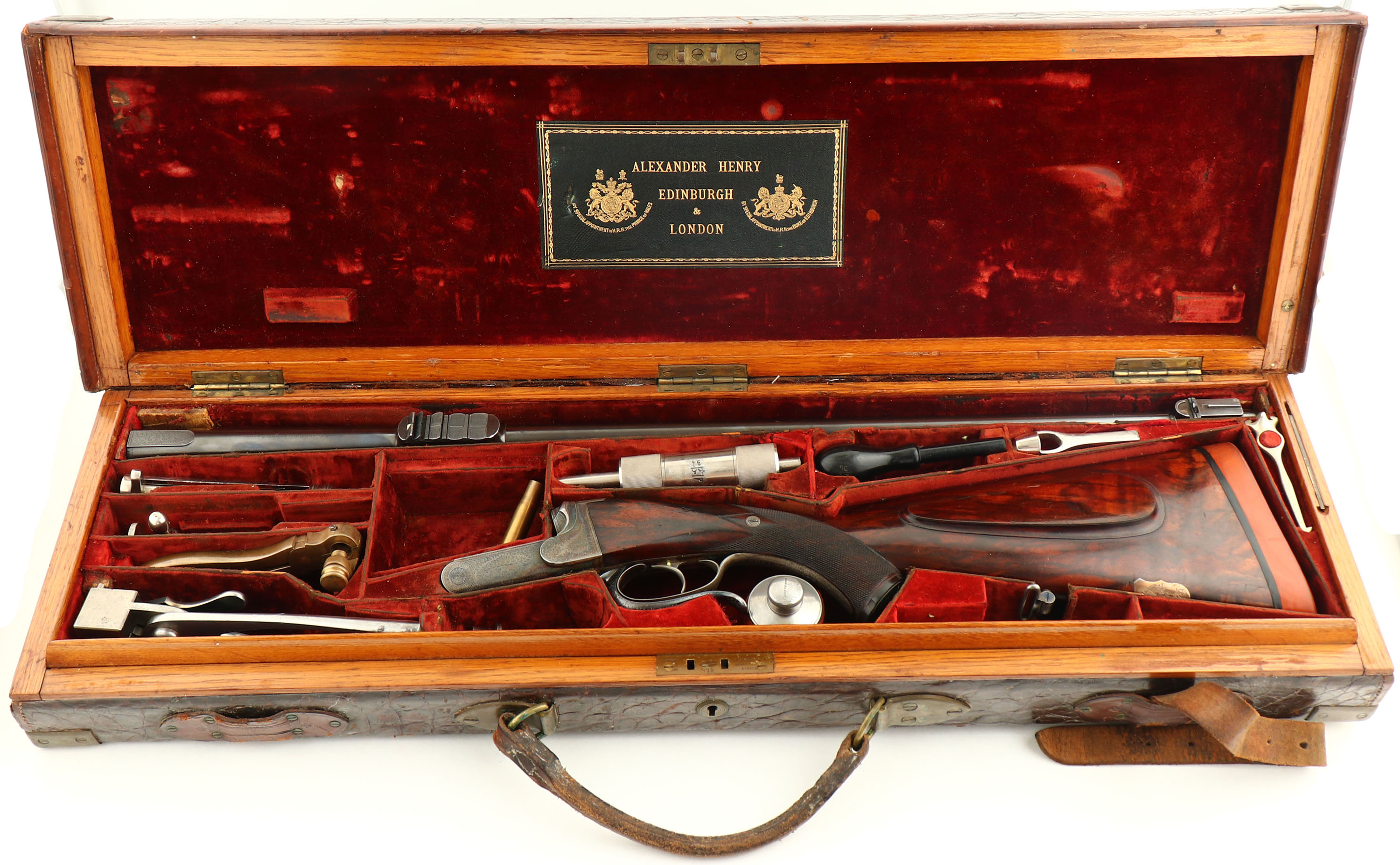 CASED & FABULOUS Alexander Henry, Model Break Under lever Rifle, CAL: 450-400, MFG: ca. 1880's Antique, SN: 6660, Lever Break Single Shot Rifle, 28'' barrel. While his name is now best associated with the British Empires Martini-Henry rifles & carbines, Alexander Henry of Edinburgh was a well respected Scottish gunmaker, officially appointed as maker to the Prince of Wales and Duke of Edinburgh. In the mid to second half of the 19th century. Henry patented his drop block rifle in 1865 & of its type, it was by far the most successful & commonly encountered rifle of the era. Henry offered his rifle in three qualities, BEST, SECOND & THIRD, with best quality pre-dominating. This appears to be of the ''BEST'' quality as it displays the engraving &detailing seen on his ''BEST'' quality. These Henry rifles are quite magnificent in terms of their quality, engraving & construction, & secured his reputation with the very high quality & numbers of single & double rifles built.