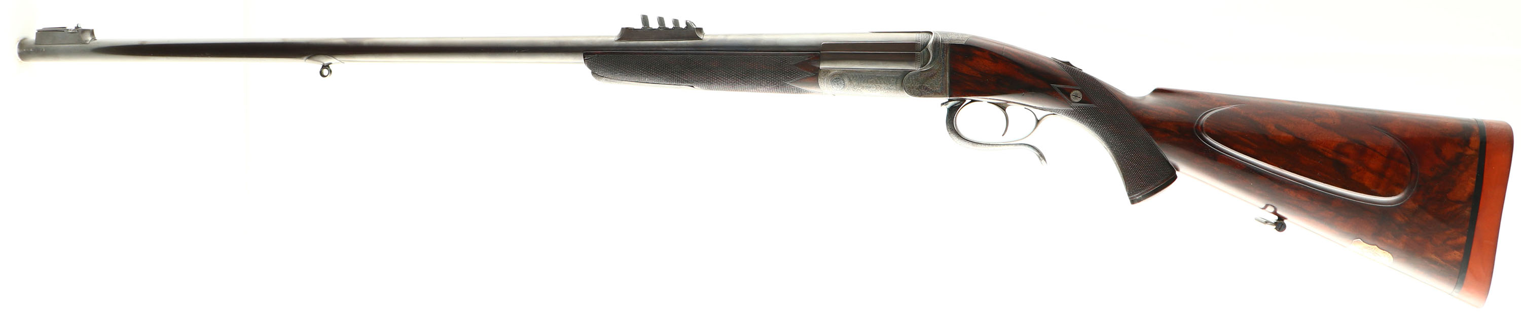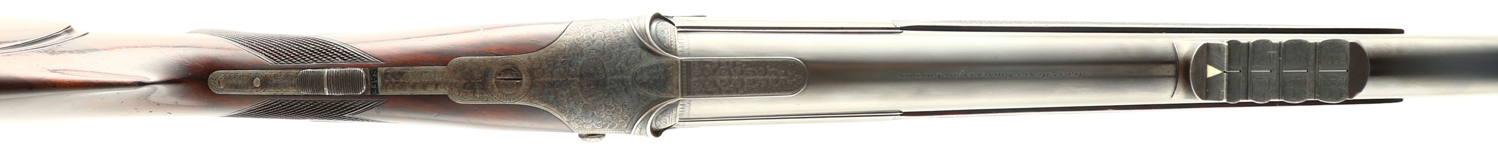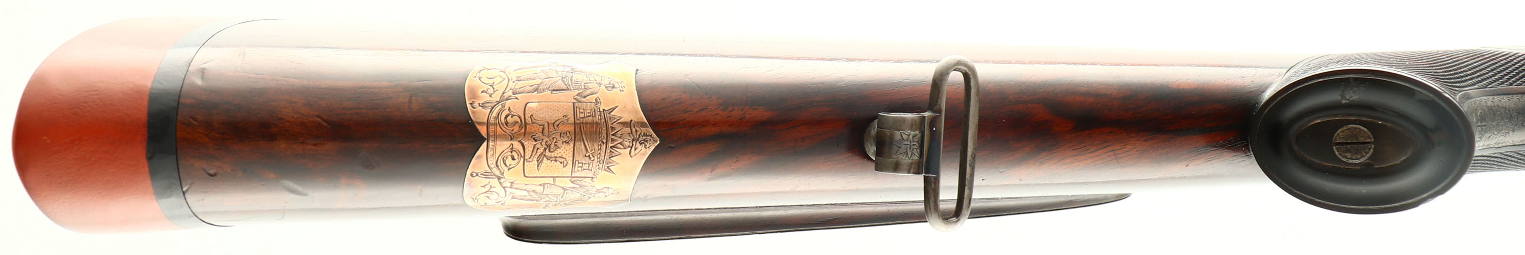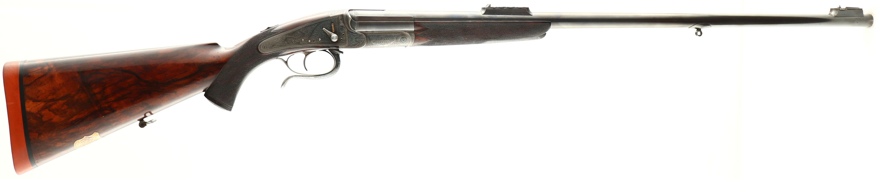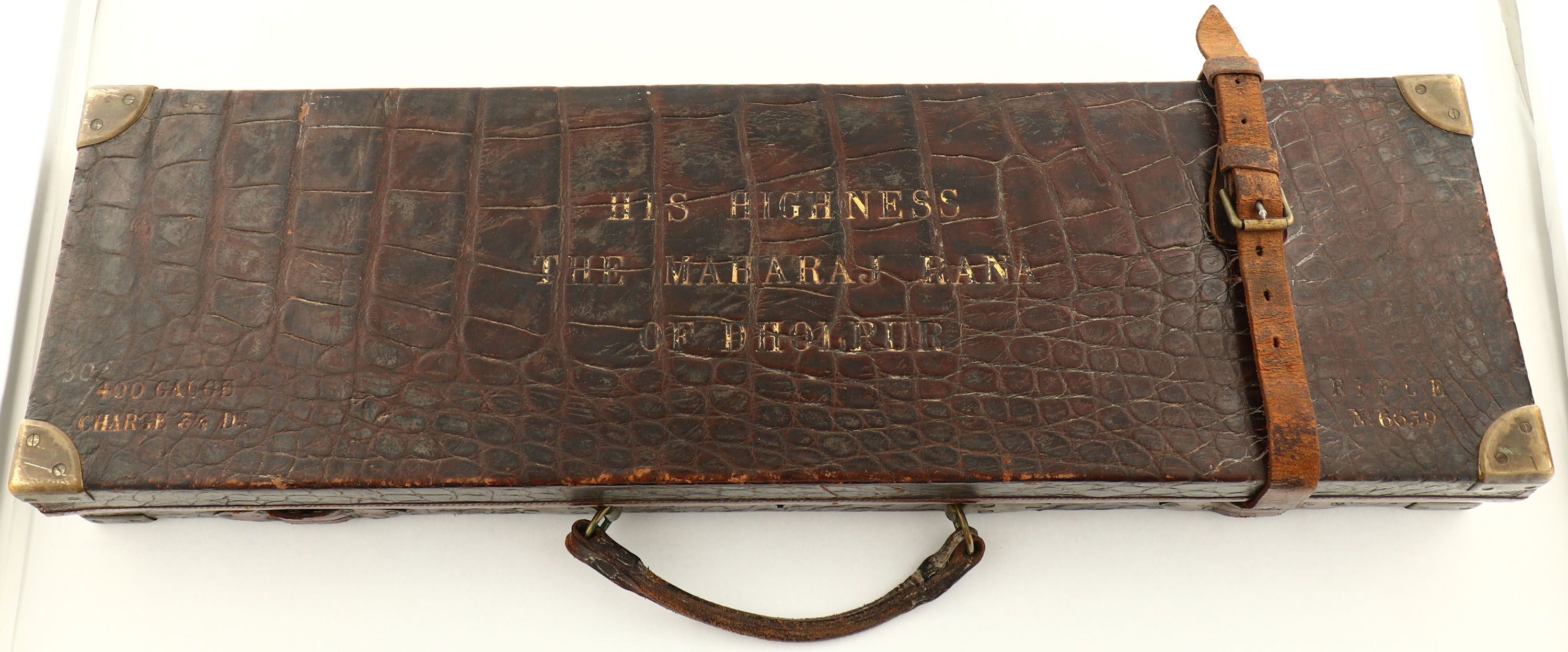 On this rifle, the cheeked, checkered & capped pistol grip walnut stocks are excellent, with a few minor handling marks to the original finish. Fantastic contrasting grain & fine hand checkering on both pieces of furniture. The belly of the stock has an inlayed gold shield, which is wonderfully engraved with a coat of arms. The case-hardened receiver displays muted case colors, with the receiver, side plate, lever, trigger guard, upper tang, forend lever, portion of the barrel & even the leaves of the rear sight all displaying high density coverage of fine vine & scroll hand engraving. The original blued barrel rates 90% coverage of a plum toning chocolate brown finish. The top of the barrel is engraved ''ALEX.R HENRY EDINBURGH & LONDON'', with British proofs on the belly of the barrel under the forend. The barrel carries a five leaf express rear sight, with leaf's marked with ranges 100, 200, 300, 400 & 500 yards. The muzzle of the barrel carries a platform raised front blade sight, with a flip-up ivory bead option. It is slotted along the side for possible use of a hood. Top of the receiver is engraved ''HENRY'S No. 243 PATENT''. The right side-plate has the auto-cock indicator, with gold ''COCKED'' lettering. The bottom of the barrel is stamped ''400 EX''. Bore is excellent & bright. The buttstock carries a solid red recoil pad. Sling provisions. Comes with an empty cartridge in the case with the headstamp indicating 450-400, which fits properly in the breech. The rifle comes displayed in a magnificent Maker's alligator hide wrapped oak case, with gold embossed lettering ''HIS HIGHNESS THE MARHARAJ RAN OF DHOLPUR''. The case also indicates that it is for ''RIFLE 6659'', one off from this rifle's SN & likely for the sister rifle to this rifle. Inside the case is a leather gold embossed Maker's label ''ALEXANDER HENRY EDINBURGH & LONDON'' & two by Special Appointment crests. The case come with a large number of tools & accessories including, Combination capper/de-capper - seats and/or removes primers, Bullet crimper, Bullet seating tool, Bullet mold with sprue-cutter, Oil bottle with applicator tip inside screw-cap, Wad-cutter, Combination case extractor & several others.