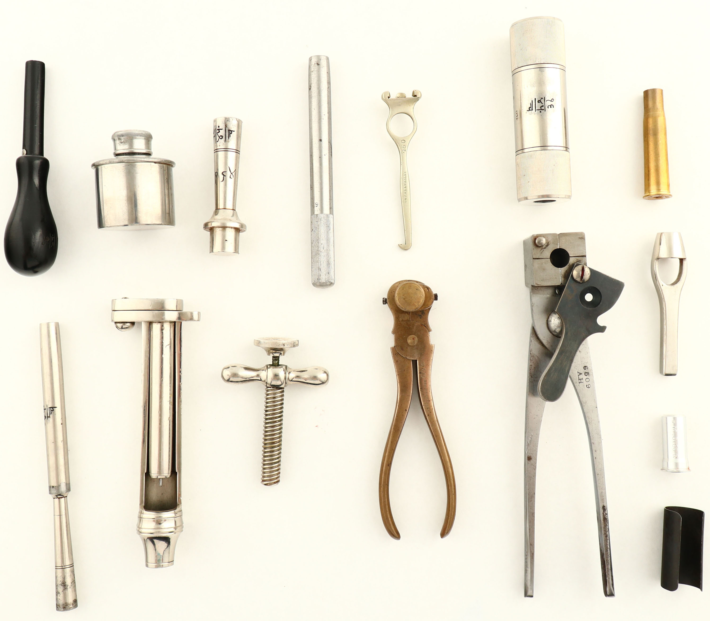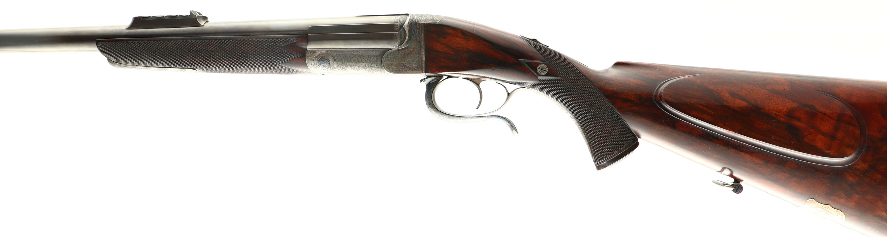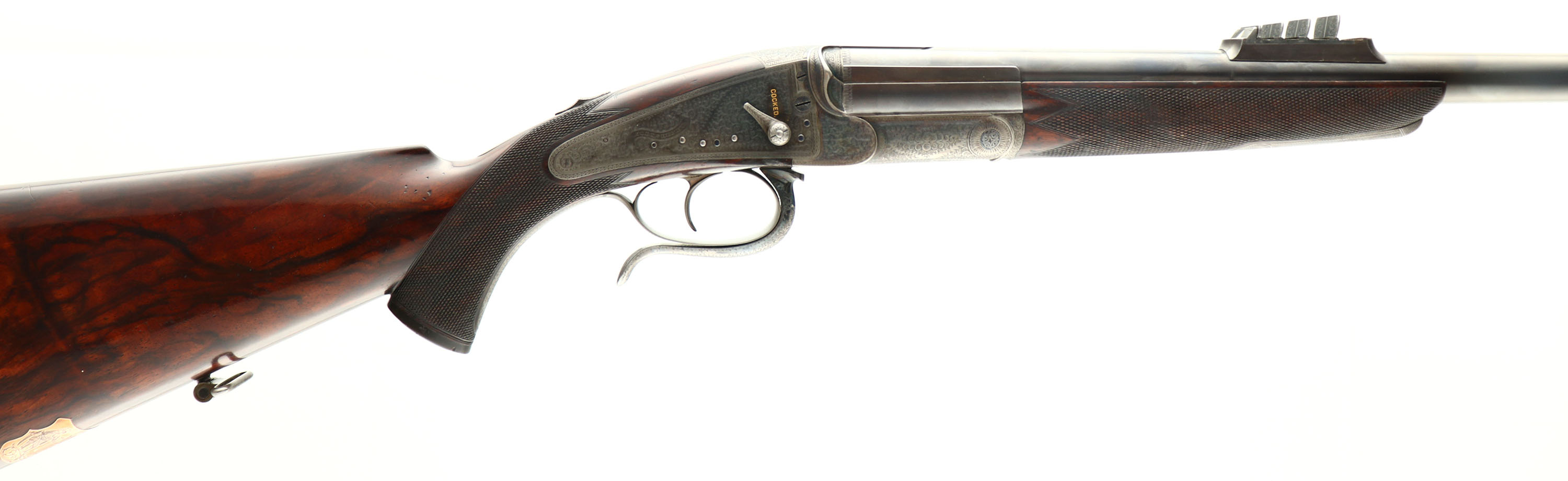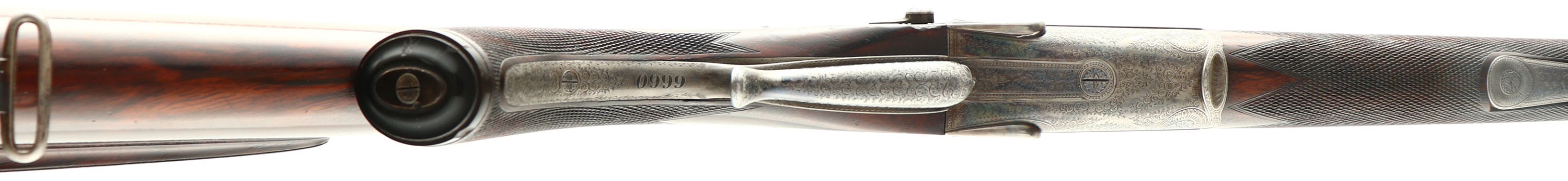 On this rifle, the cheeked, checkered & capped pistol grip walnut stocks are excellent, with a few minor handling marks to the original finish. Fantastic contrasting grain & fine hand checkering on both pieces of furniture. The belly of the stock has an inlayed gold shield, which is wonderfully engraved with a coat of arms. The case-hardened receiver displays muted case colors, with the receiver, side plate, lever, trigger guard, upper tang, forend lever, portion of the barrel & even the leaves of the rear sight all displaying high density coverage of fine vine & scroll hand engraving. The original blued barrel rates 90% coverage of a plum toning chocolate brown finish. The top of the barrel is engraved ''ALEX.R HENRY EDINBURGH & LONDON'', with British proofs on the belly of the barrel under the forend. The barrel carries a five leaf express rear sight, with leaf's marked with ranges 100, 200, 300, 400 & 500 yards. The muzzle of the barrel carries a platform raised front blade sight, with a flip-up ivory bead option. It is slotted along the side for possible use of a hood. Top of the receiver is engraved ''HENRY'S No. 243 PATENT''. The right side-plate has the auto-cock indicator, with gold ''COCKED'' lettering. The bottom of the barrel is stamped ''400 EX''. Bore is excellent & bright. The buttstock carries a solid red recoil pad. Sling provisions. Comes with an empty cartridge in the case with the headstamp indicating 450-400, which fits properly in the breech. The rifle comes displayed in a magnificent Maker's alligator hide wrapped oak case, with gold embossed lettering ''HIS HIGHNESS THE MARHARAJ RAN OF DHOLPUR''. The case also indicates that it is for ''RIFLE 6659'', one off from this rifle's SN & likely for the sister rifle to this rifle. Inside the case is a leather gold embossed Maker's label ''ALEXANDER HENRY EDINBURGH & LONDON'' & two by Special Appointment crests. The case come with a large number of tools & accessories including, Combination capper/de-capper - seats and/or removes primers, Bullet crimper, Bullet seating tool, Bullet mold with sprue-cutter, Oil bottle with applicator tip inside screw-cap, Wad-cutter, Combination case extractor & several others.