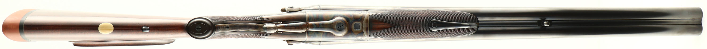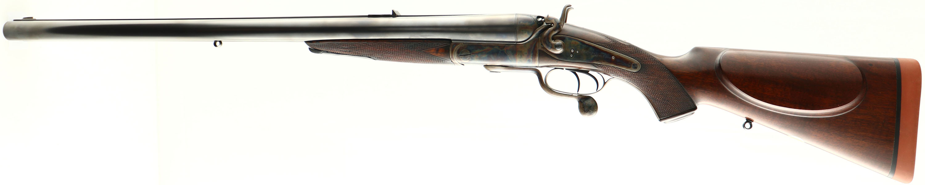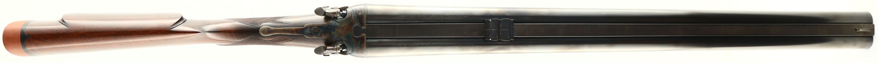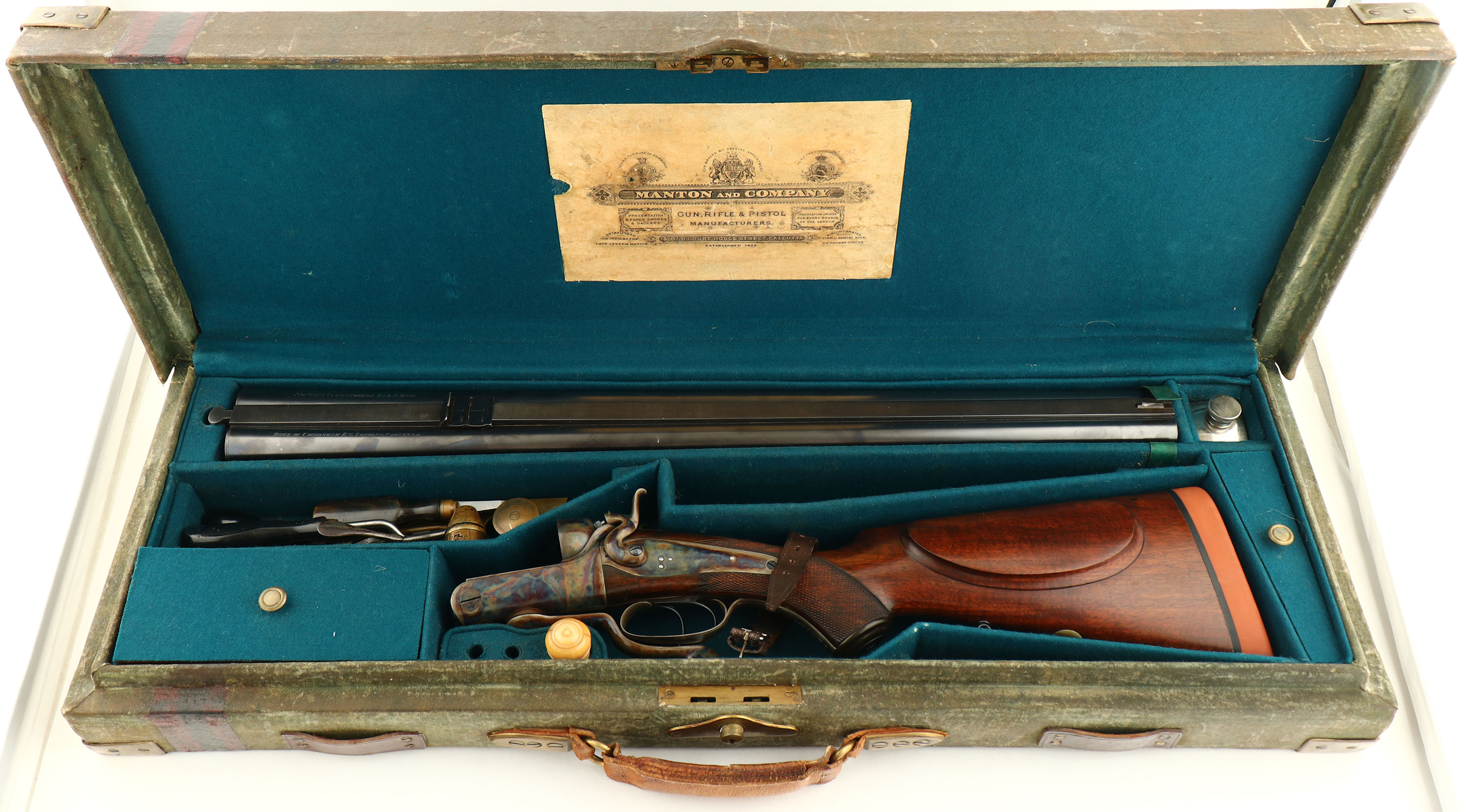 FANTASTIC CASED MANTON & CO., Model Hammer Underlever Sidelock Double Rifle, CAL: 10-BORE, MFG: Antique, SN: 5673, Lever Break Double Shot Rifle, 26'' SxS fluid-steel barrels, with solid flat matted rib, 1 standing & 2 folding platinum-lined express sights engraved for 100, 200 & 300 yards. English walnut stocks, with lever-release splinter forend, bakelite pistol grip cap, classic point-pattern checkering, beaded pancake cheekpiece, sling eye, & vacant initial oval. Finish & condition is excellent with very few handling marks. Border-engraved, case-hardened receiver & sidelocks, with Jones underlever, rebounding locks & no separate safety catch. Case-colors remain vivid. 97% coverage of the rich bluing on carrels. London black powder proved. Tight & with excellent bores. Sling eye, & doll's head extension. 14 3/8'' pull from front trigger to the end of the Silvers red rubber recoil pad. Weight: 14lbs, 5oz. Comes stored in period canvas wrapped trunk case, with brass corners, maker's label & innumerable loading accessories. Investment grade & highly collectible double rifle. An overall excellent & collector/investment grade hand crafted rifle. Antique, No FFL Req. - Value: 10000 to 15000