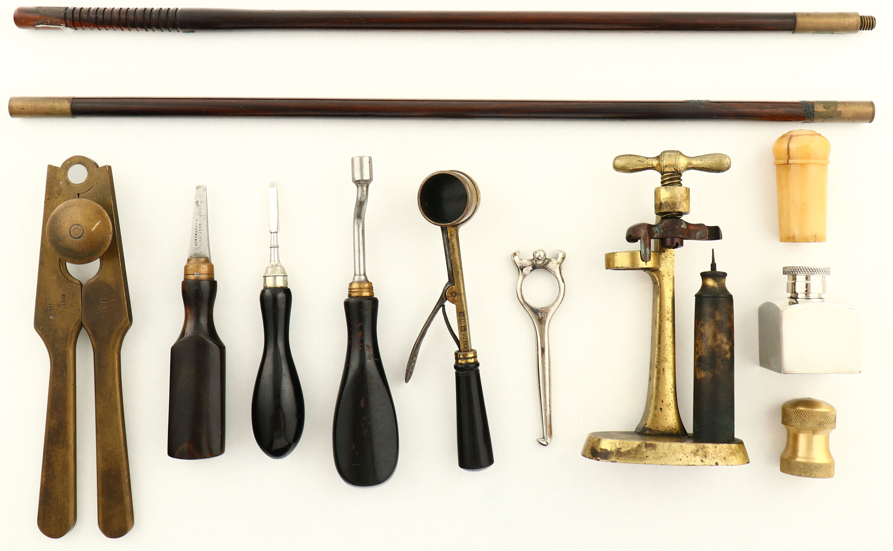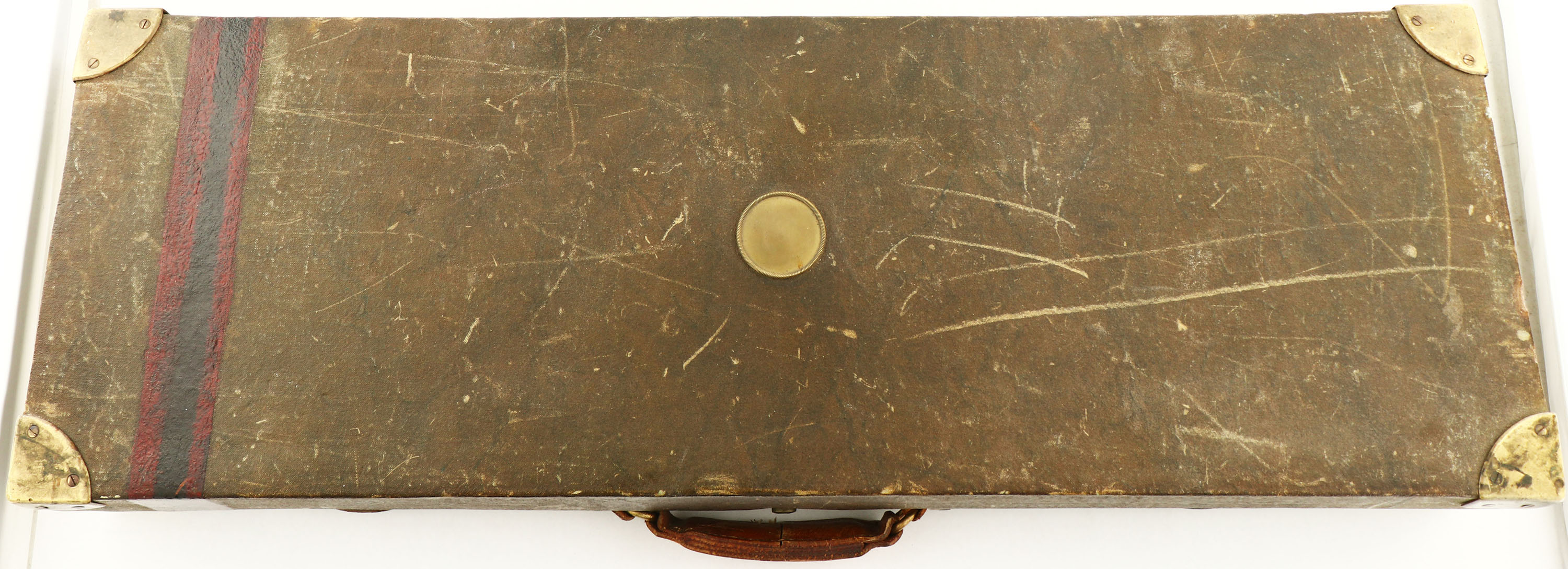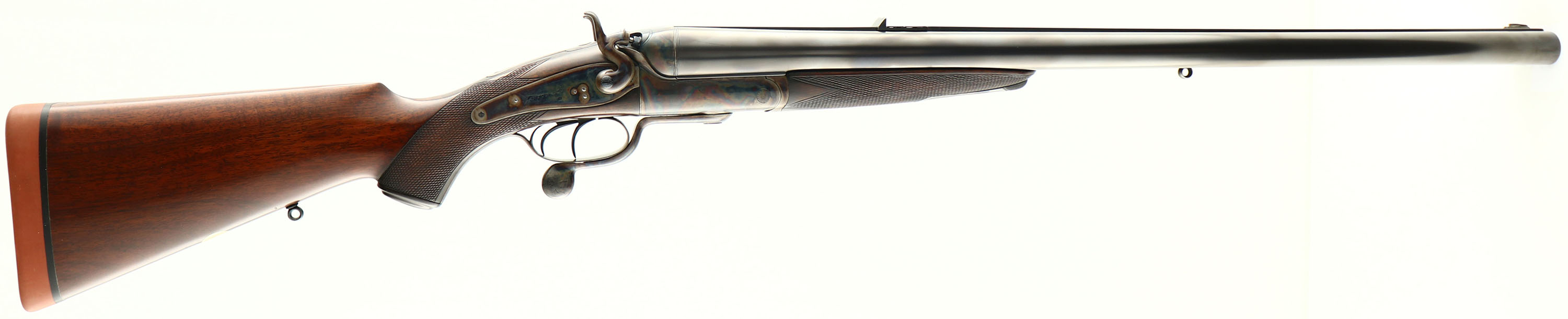 FANTASTIC CASED MANTON & CO., Model Hammer Underlever Sidelock Double Rifle, CAL: 10-BORE, MFG: Antique, SN: 5673, Lever Break Double Shot Rifle, 26'' SxS fluid-steel barrels, with solid flat matted rib, 1 standing & 2 folding platinum-lined express sights engraved for 100, 200 & 300 yards. English walnut stocks, with lever-release splinter forend, bakelite pistol grip cap, classic point-pattern checkering, beaded pancake cheekpiece, sling eye, & vacant initial oval. Finish & condition is excellent with very few handling marks. Border-engraved, case-hardened receiver & sidelocks, with Jones underlever, rebounding locks & no separate safety catch. Case-colors remain vivid. 97% coverage of the rich bluing on carrels. London black powder proved. Tight & with excellent bores. Sling eye, & doll's head extension. 14 3/8'' pull from front trigger to the end of the Silvers red rubber recoil pad. Weight: 14lbs, 5oz. Comes stored in period canvas wrapped trunk case, with brass corners, maker's label & innumerable loading accessories. Investment grade & highly collectible double rifle. An overall excellent & collector/investment grade hand crafted rifle. Antique, No FFL Req. - Value: 10000 to 15000