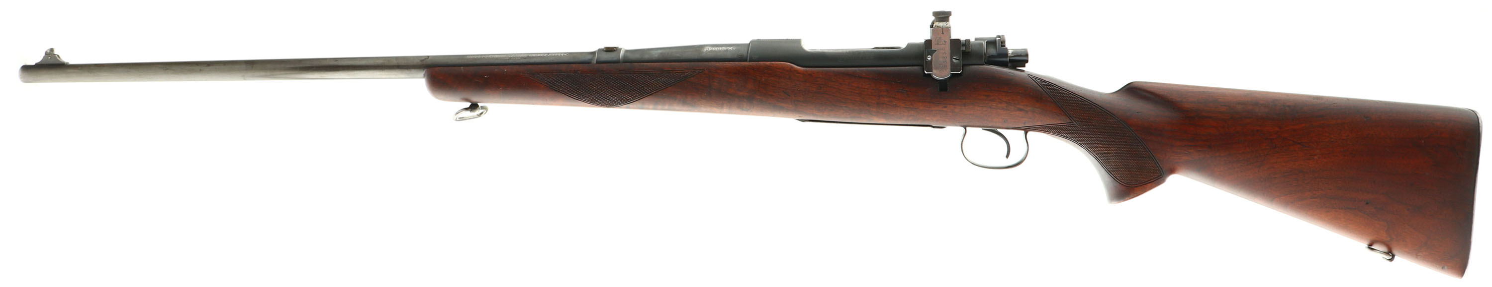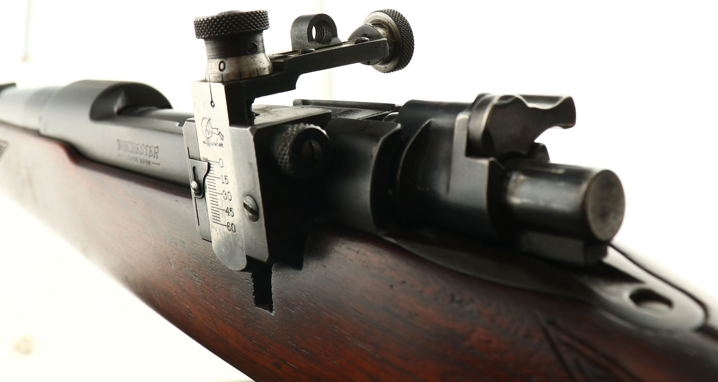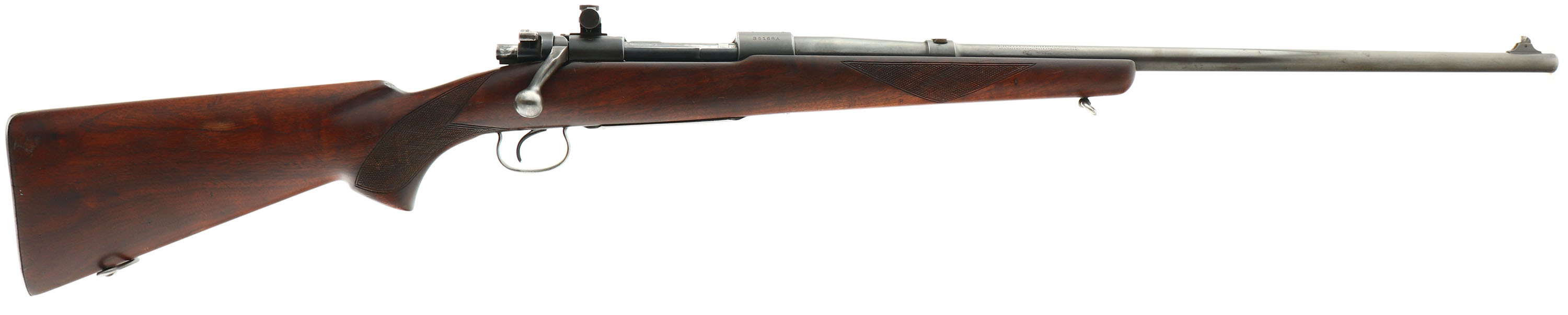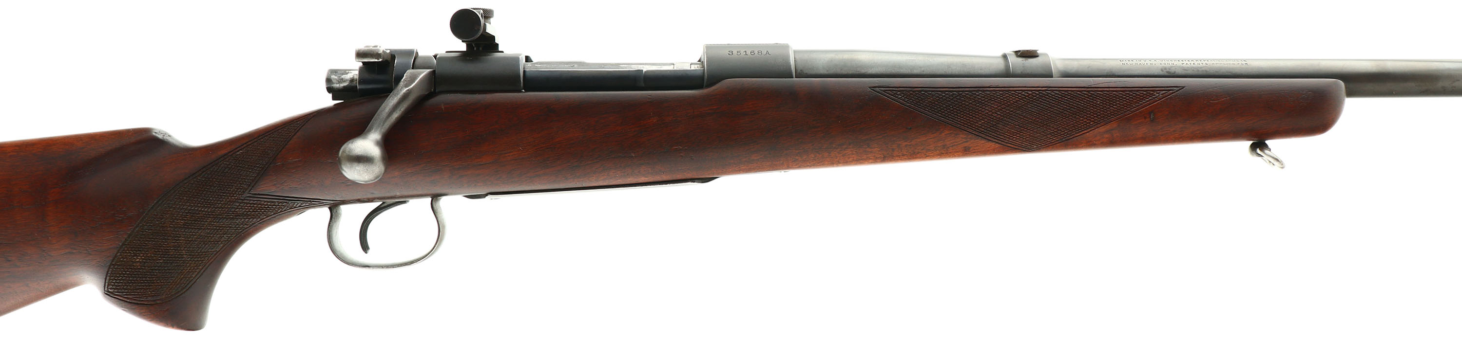 Winchester Model 54, CAL: .30 GOV'T'06., MFG: 1931, SN: 35168A, Bolt Action Rifle, 24'' barrel. The model 54 was the first successful civilian bolt action for Winchester. They are a fairly rare model with total production of just over 50,000 in all variations from 1925 to 36. The original checkered & flat pistol grip wood stock on this example is excellent, with several minor contusions, scrapes & scratches to the original finish. The finish has darkened some from use & oiling. The metal blue finish is toning gray with coverage rating 85% on the receiver, 75% on the barrel, with loss due more to density thinning rather than coverage. The floorplate & trigger guard display greater wear & toning gray. Bore rates excellent. The rifle is fitted with the desired & fully adjustable Lyman 48C receiver sight, while the barrel has a blank filled rear dovetail & standeard pinned blade front sight. Some wood alteration around the Lyman receiver sight. Buttstock carries the original serrated metal buttplate. Sling loops. A good example of an early Winchester bolt action. FFL or C&R Req - Value: 800 to 1500