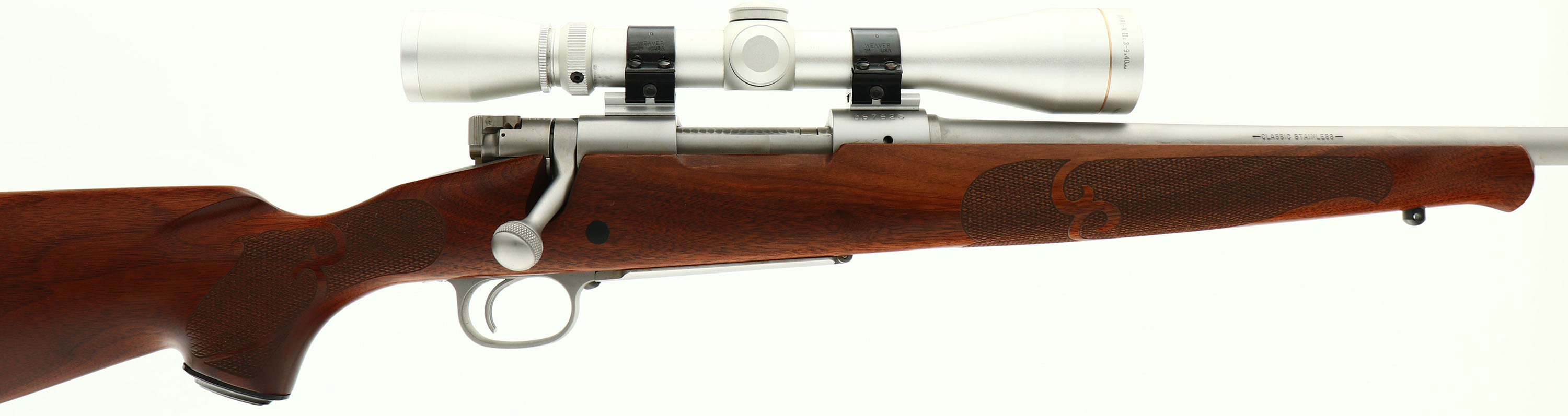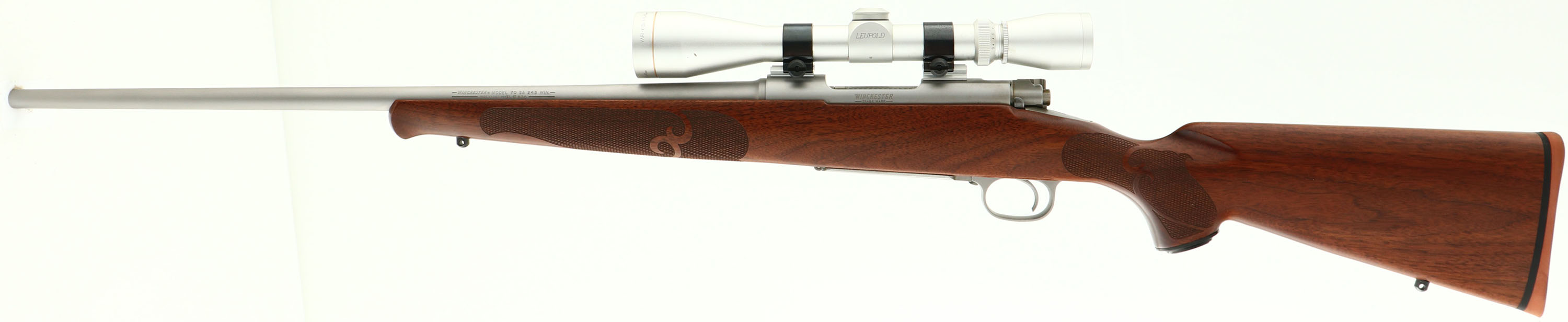 Winchester, Model 70 SA Classic Stainless, CAL: 243 WIN, MFG: 1992-2006, SN: G67626, Bolt Action Rifle, 21 3/4'' barrel. The original checkered & capped pistol grip wood stock is excellent, with few tiny handling marks to the excellent original finish. The stainless steel metal finish rates 100% overall. Bore is excellent & bright, with sharp rifling. Rifle is mounted with a Leupold Vari-X 3-9X40mm matching scope, with no open sight provisions. Buttstock carries a Winchester solid rubber recoil pad. Jeweled bolt. Sling stud. An excellent Model 70 Classic Stainless.* FFL Req. - Value: 1000 to 1400
