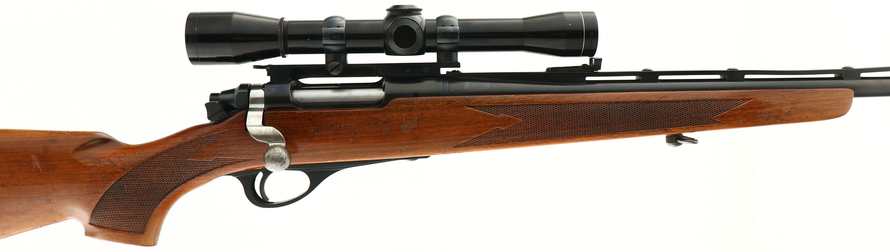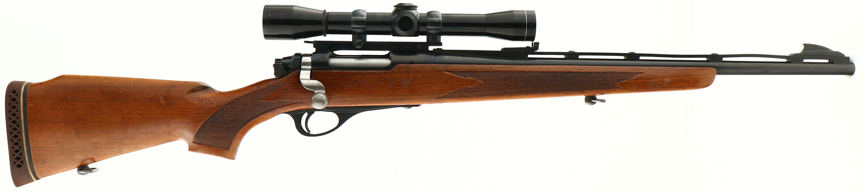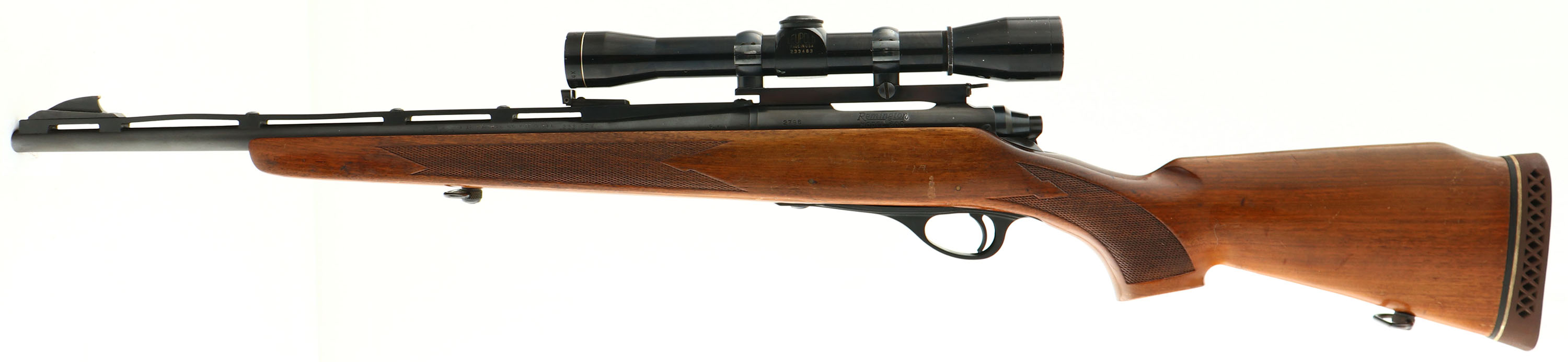 Remington, Model 600 Carbine, CAL: 222 REM, MFG: 1964, SN: 2796, Bolt Action Rifle, 18 1/2'' barrel. Low serial number & early first year production rifle. The model 600 was designed to be a guide rifle, with it's compact size (short barrel length). A fairly rare rifle as production started in 1964 & ended just three years later in 1967, with just over 94,000 produced in 8 different calibers, the .222 Rem being one of the lowest production calibers. The original checkered, raised comb & flat pistol grip wood stock is excellent, with several minor to small scuffs & scrapes to the original finish. The metal blue finish rates 95% overall. Bore is excellent. The receiver carries a Leupold M8-4X Gold Ring scope mounted on Redfield rings & rail. The ventilated rib carries the original rear & elevated blade front sights. Buttstock carries a Pachmayr ventilated recoil pad. Dog leg bolt handle. Sling loops. A great compact bolt rifle & set up for hunting season. FFL or C&R Req. - Value: 800 to 1200