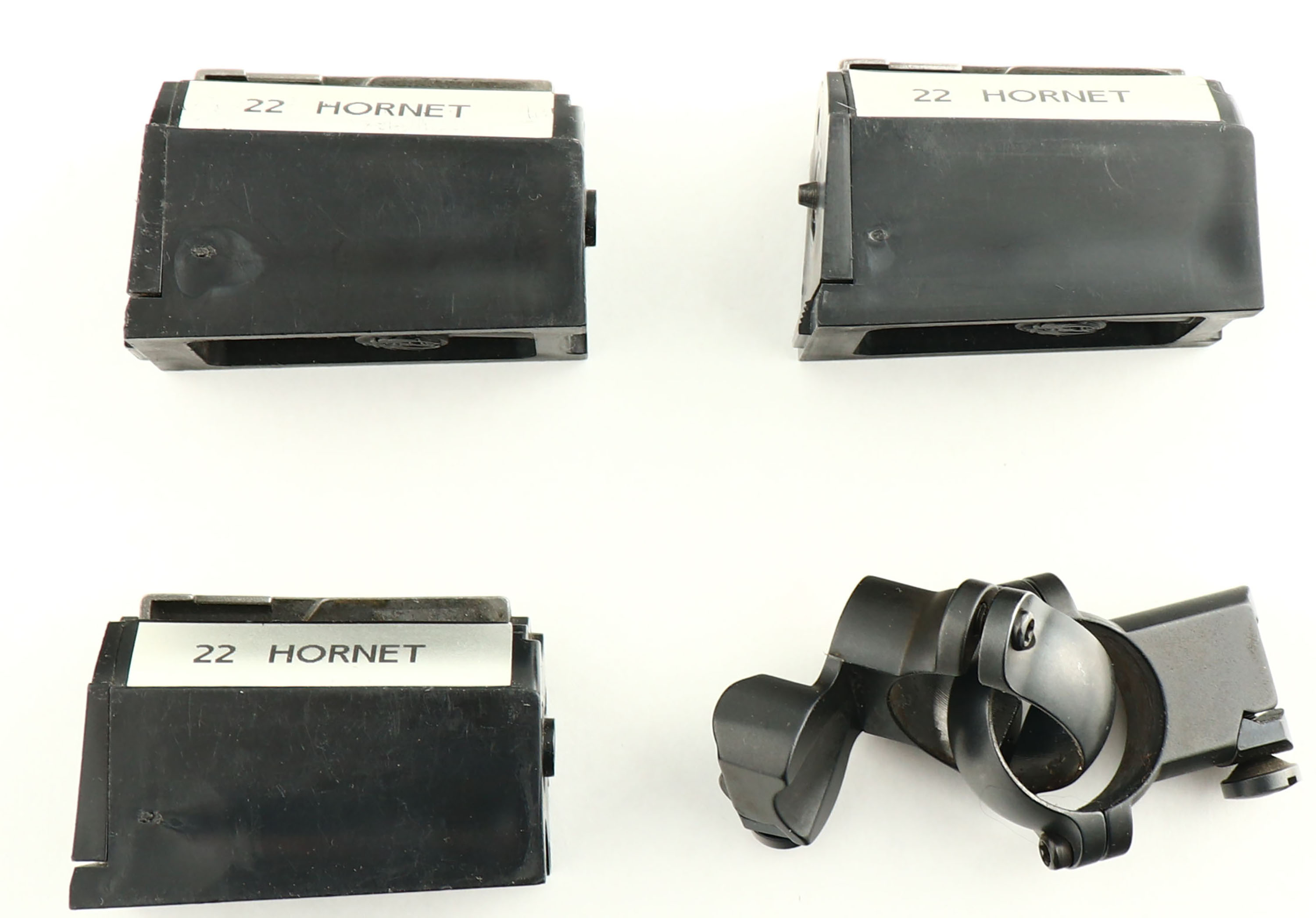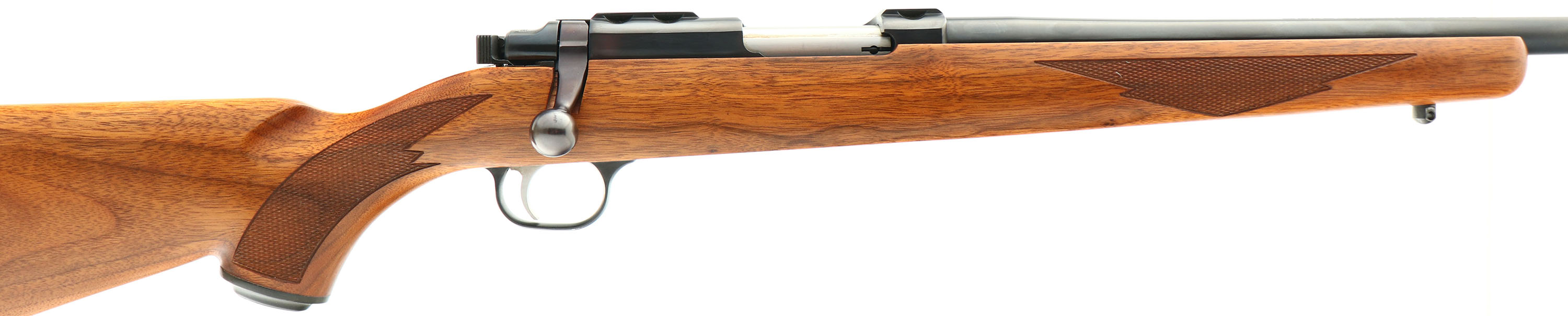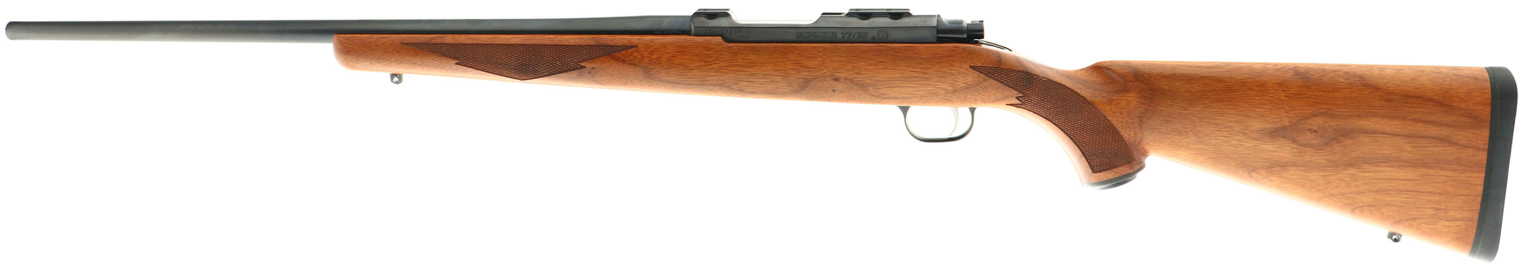 Ruger, Model 77/22, CAL: 22 Hornet, MFG: 1994, SN: 720-07297, Bolt Action Rifle, 20'' barrel. The original checkered & Ruger logo capped pistol grip wood stock is excellent, with virtually no handling marks to the excellent original finish. Sharp checkering. The metal blue finish rates 99% overall, with the receiver & bolt handle starting to tone the typical plum. Bore is excellent. The receiver has integral scope mounts machined directly into the solid steel receiver, & comes with the factory sope mounts & rings for future scope mounting. No provision for open sights on the barrel. Buttstock carries a Ruger logo solid black rubber recoil pad. Sling studs. Comes with four factory detachable mags. FFL Req. - Value: 800 to 1200