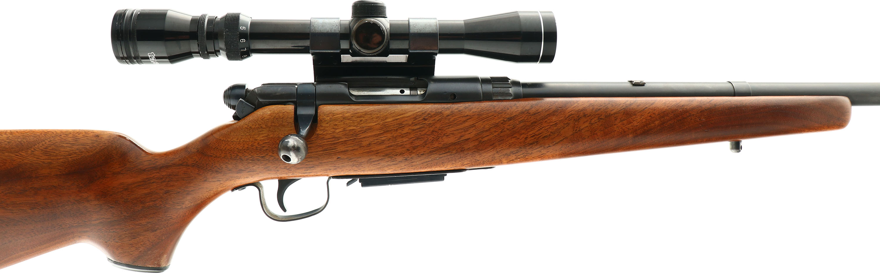 Savage, Model 340 E Series, CAL: .223 REM, MFG: Early 1970's, SN: None, Bolt Action Rifle, 22'' Round barrel. The capped pistol grip & Monte Carlo style wood stock is excellent. It appears to the be the original factory stock with the Savage Arms & indian profile logo on the cap, but most ''E'' series rifles came with a checkered stock, which is not the case with this rifle. The smooth grips are excellent, carrying the original finish with an added thin layer of finish. There are a few minor dings or scrapes to the excellent finish. The original metal blue finish rates 85% overall. Bore is excellent & bright. The rifle carries a Tasco 3-9 scope on Weaver mount, while the barrel has a blank filled rear dovetail & the ramped front sight provision removed. Buttstock carries the original serrated plastic buttplate. Original detachable mag. Sling studs. FFL or C&R Req. - Value: 300 to 500