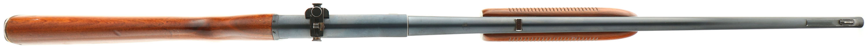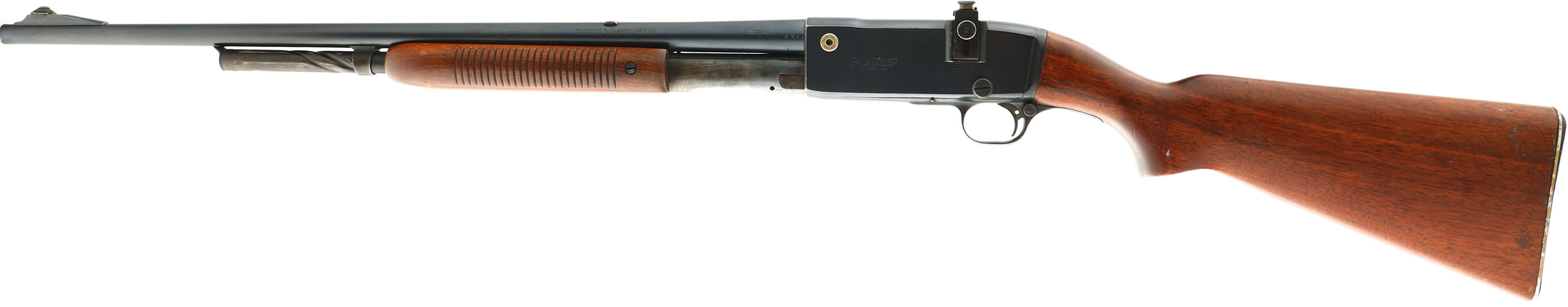 Remington, Model 141 Gamemaster, .35 REM Cal., MFG: 1935-50, SN: 50113. Pump Auction Take-down Rifle, 24'' round barrel. The original flat pistol grip wood stocks are very good & solid. The stocks carry the original finish, but with an added layer of finish on the stock. There are also several small contusions, scrapes & scratches. The original metal blue finish on the barrel & receiver rates 80%, 40% on the mag tube. Bore is excellent. Receiver carries a Lyman 56 side mount receiver sight, while barrel carries a blank filled rear dovetail & blade front sight. Stock carries a Remington serrated metal buttplate. Action is tight & functions well. A nice looking vintage pump hunting rifle. FFL or C&R Req. - Value: 300 to 600