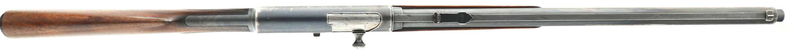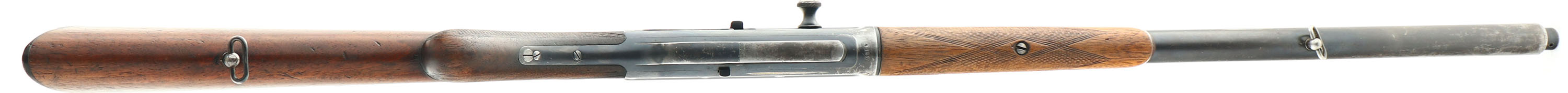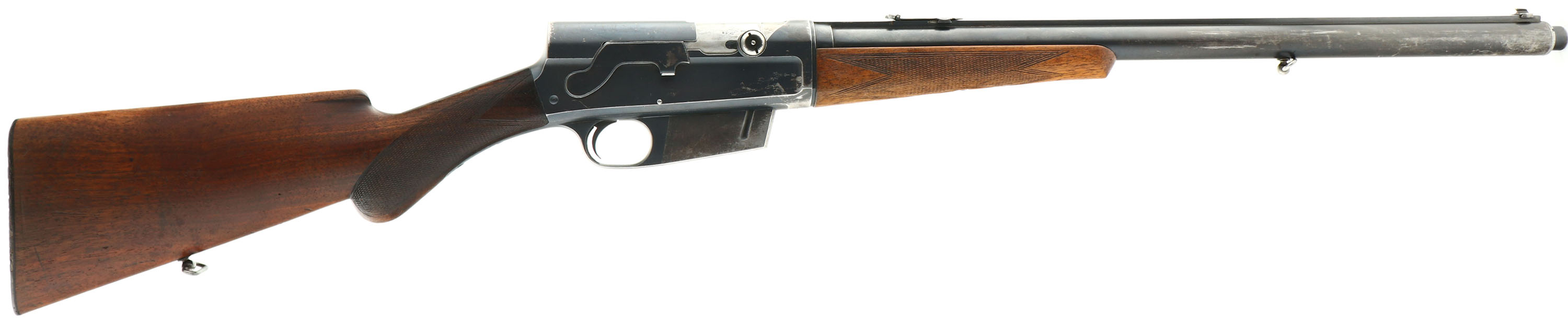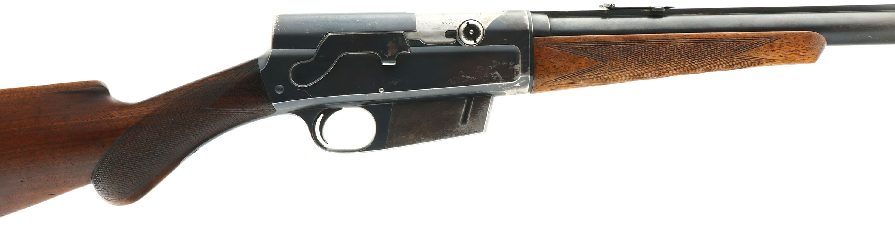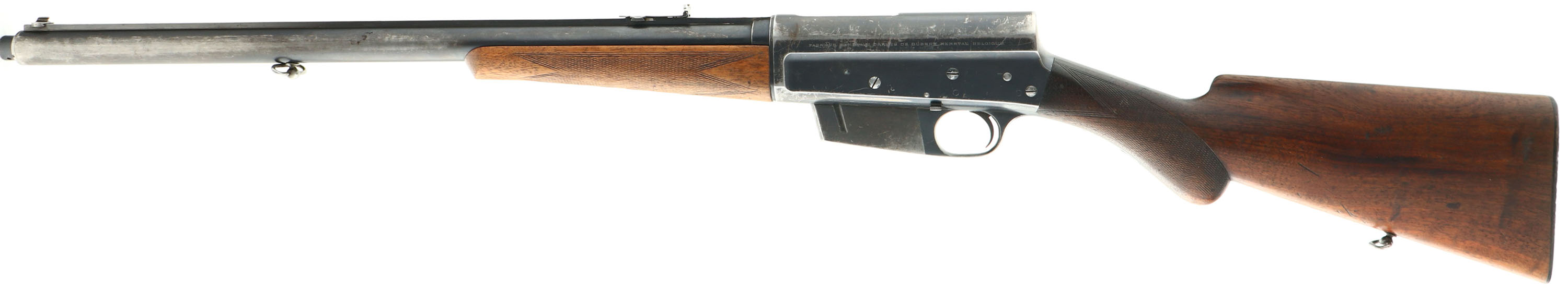 RARE FN (Fabrique Nationale), Modele 1900, .35 Rem Cal., MFG. 1926, SN: 4165, Semi-Auto Rifle, 22'' barrel, Made in Belgium & one of only 4,913 Modele 1900's produced. This is a late production rifle, with some variation to the rifle in the previous listing. Also read the previous listing for greater detail about these rare FN 1900 rifles. This rifle has the original English walnut round knob pistol grip stock & schnabel tip forend. The hand cut factory checkering is 20 lines-per-inch, with the later 2nd style forearm checkering pattern. The stocks condition is excellent, but the stock has darkened some with age & use, the the forend showing more smoothing of the checkering & thinning to the finish. There are several minor to small handling marks, scuffs, scrapes & contusions to the wood, but consistent with honest wear. The The checkering is very good, with some smoothing found mostly on the forend. The original metal blue finish rates approximately 70% overall, with blue wearing most to the mag, left side of the receiver & forward half the barrel. The left side of the receiver carries the factory roll stamp & proof markings. Matching SN's found on the receiver, barrel, forend, inside side of lower tang & inside lower channel of stock. Bore is excellent & bright. The solid matted barrel rib runs the length of the jacket & is fitted with an updated Marbles folding leaf rear sight & correct front blade sight dovetailed into the barrel rib. The stock carries the original horn & later variation ''FN'' & ''Automatic Browning'' buttplate. Original sling loops. Tight action that appears to function as it should. A very nice late production example of this rare & highly collectible rifle. FFL or C&R Req. - Value: 3000 to 4500