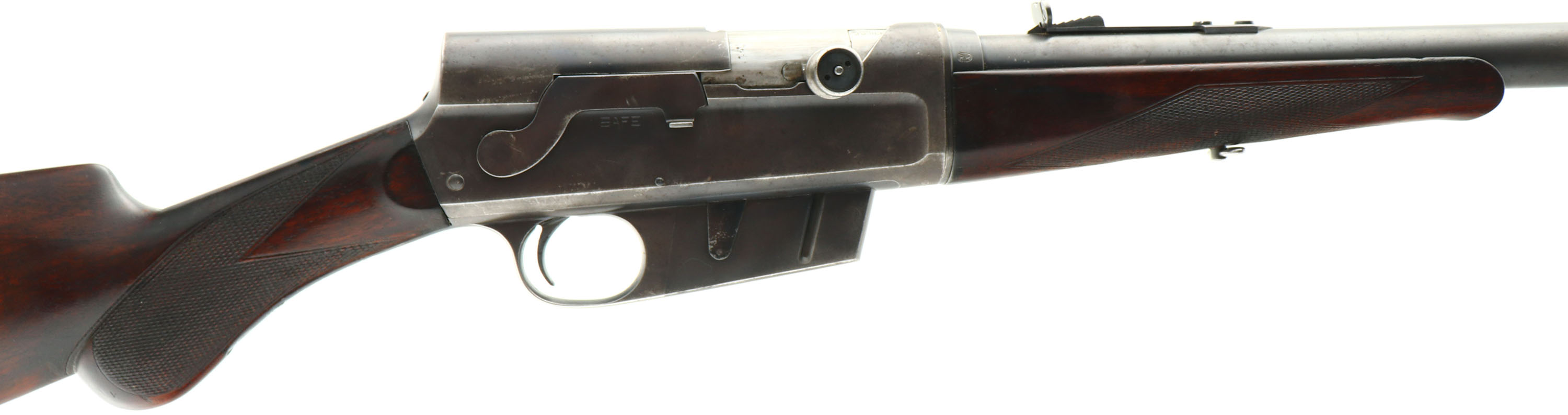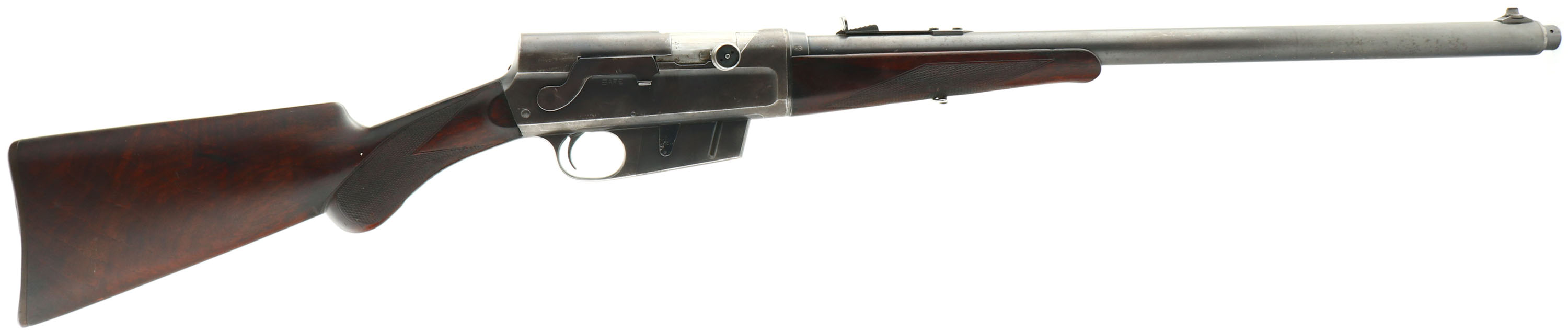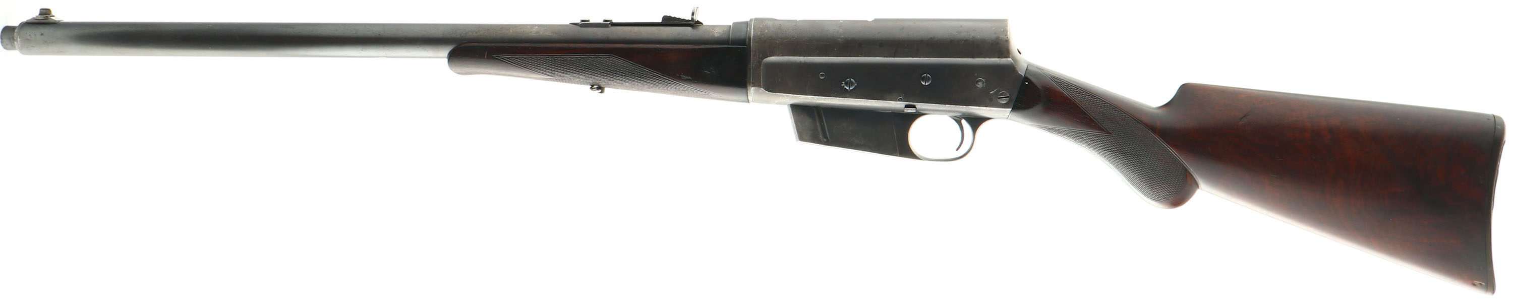 Remington, Model 8 Deluxe possibly ''C'' grade, marked .35 Rem Cal., MFG: 1914, SN: 33425, Semi-auto take-down rifle, 22'' barrel, The original deluxe checkered & round knob pistol grip wood stocks are excellent & solid. The inside of the forend is not stamped with a 3 for grade ''3'' or ''C'' grade, however that is not that uncommon as not all ''C'' grades were stamped just as not all forends were stamped with the matching SN either. The stocks do have nicer rippled grain, much nicer than standard straight grain. The stocks display hand checkering cut at 20 lines per inch. Being an earlier production rifle & a delux/C grade, the stock carries the cheeks at the wrist. There are minor scrapes, scratches & contusions to the original finish. There is some staining & darkening to the finish, particularly at the carry points & there may be a thin added layer of protective finish over the original or some oils. The original metal blue finish has good coverage, but honest wear has thinned the density of the blue to 65% on the barrel & 60% on the receiver, with the blue toning a greyish brown as it thins. The barrel carries an adjustable rear & standard front sight. Bore is very good, clean & bright. Stock carries the Remington UMC plastic buttplate. 4 rd fixed magazine. Tight action. A rare & very nice ''C'' grade/deluxe rifle, which is very collectible. FFL or C&R Req. - Value: 2000 to 3000