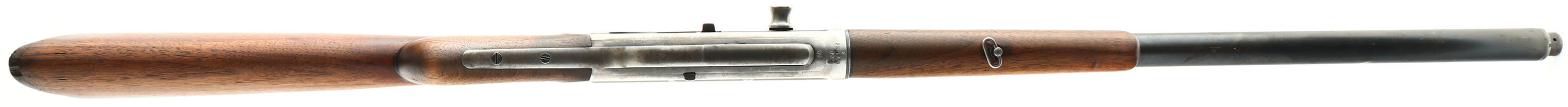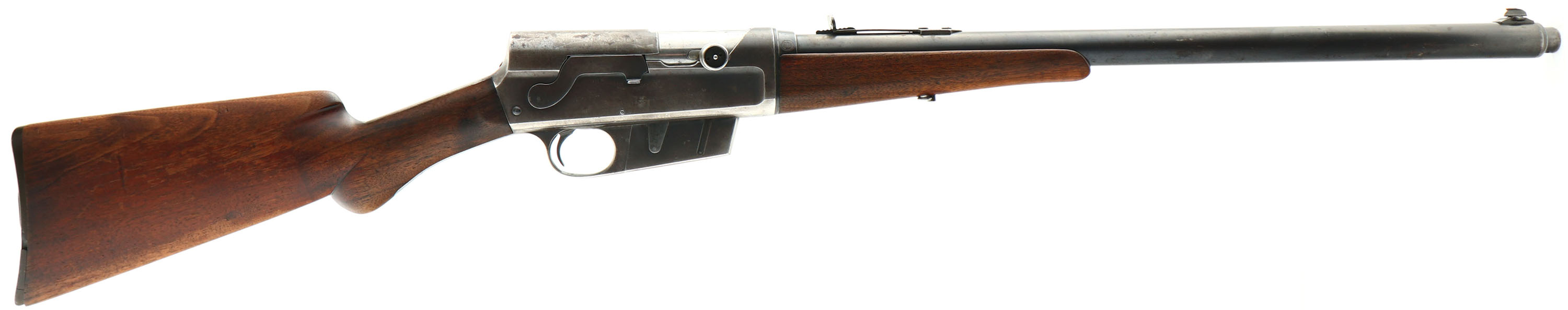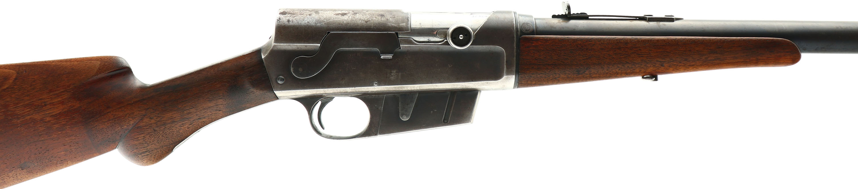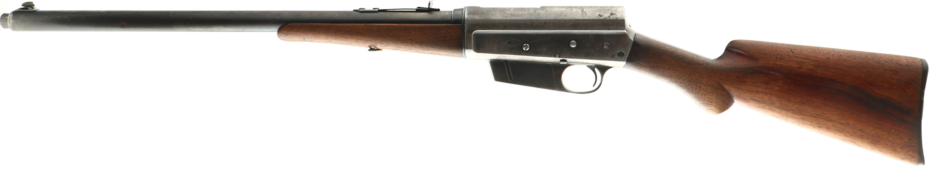 Remington, Model 8, 32 REM CAL, MFG. 1911, SN: 25610, Semi-Auto Rifle, 22'' barrel. The original round knob pistol gripped wood stocks are very good & solid. Much of the the original wood finish has worn or flaked away, particularly at the carry points. There are minor scrapes, ding & contusions to the wood. The original metal blue finish rates 40% on the barrel, while the receiver has worn mostly gun metal gray, with maybe 15% of thinned toning blue remaining in more protected areas. The barrel has standard adjustable rear sight & elongated front blade sight. Bore is good, but with some roughness amongst strong rifling. Stock carries the Remington plastic buttplate, which has broken in several places & been glue assembled, a couple of missing edge chips & a small internal piece missing. 5 rd fixed magazine. The right sidee of the barrel collar has a ''RB'' stamped inside a circle. The barrel has a couple of small contusions. A well used hunting rifle, but with lots of hunting life remaining. FFL or C&R Req. - Value: 400 to 800