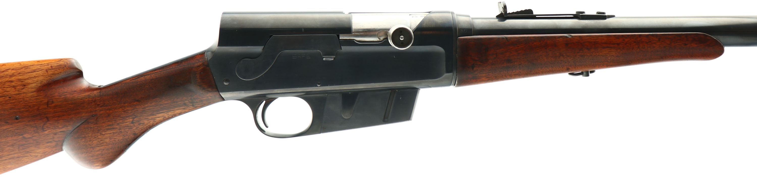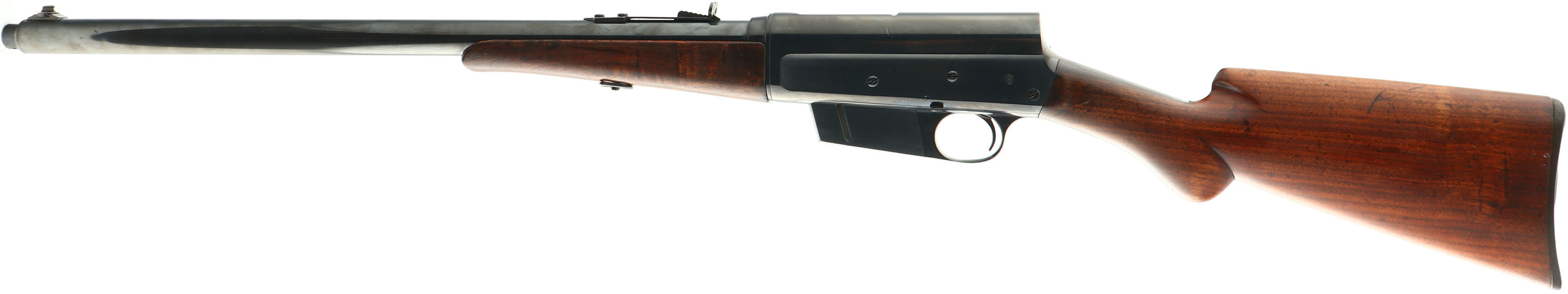 Remington, Model 8, .25 REM CAL, MFG. 1913, SN: 31430, Semi-Auto Rifle, 22'' barrel. The original round knob pistol gripped wood stocks are very good & solid. The finish has worn & been lightly sanded to even it out & has been reoiled leaving a hand oiled appearance. There are numerous minor scrapes, scratches & contusions remaining on the wood . The metal blue finish has been professionally reblued rating 95% overall. The barrel has standard adjustable rear & front blade sights. Bore is very good, but dark amongst strong rifling. Stock carries the Remington plastic buttplate. 5 rd fixed magazine. A good looking, partially restored, round knob rifle in the collectible .25 caliber. FFL or C&R Req. - Value: 500 to 1000