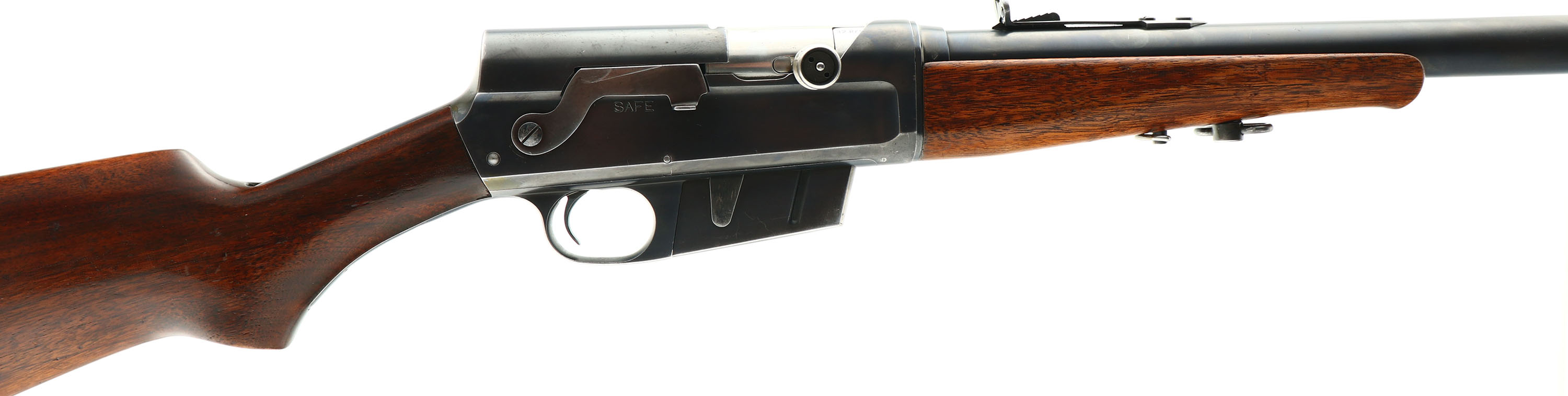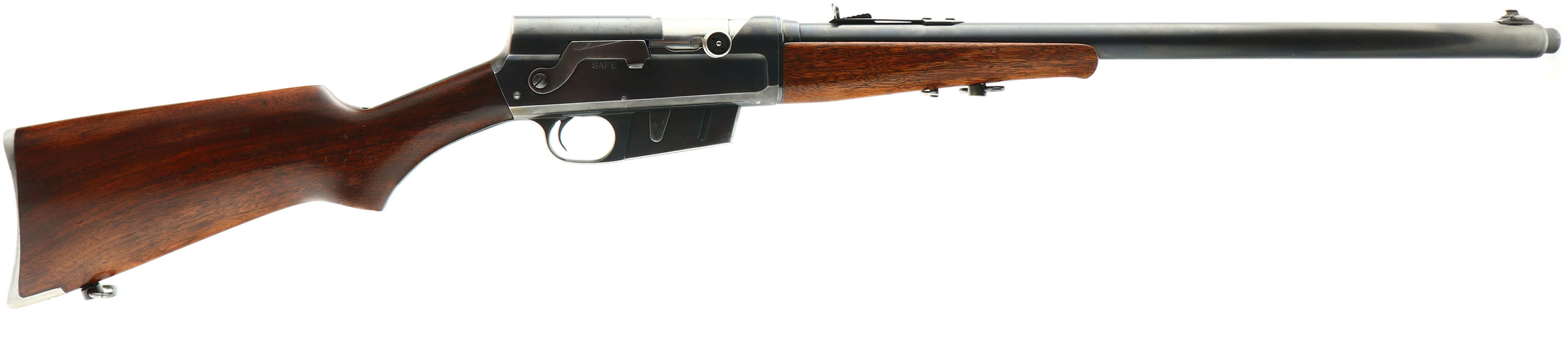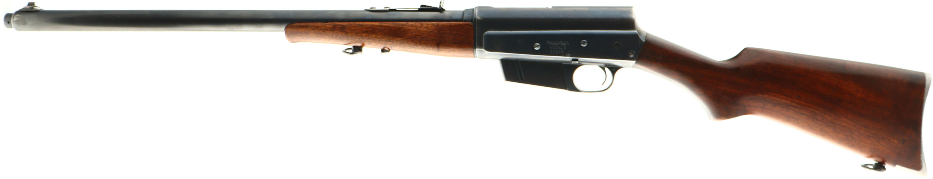 Remington, Model 8, 32 REM CAL, MFG. 1931, SN 65268, Semi-Auto Rifle, 22'' barrel. Straight grip stock are most often found in the early years, with the round knob becoming more in vogue in the 1910-20's & finally the flat knobs becoming more popular in the late 20's & early 30's. This early 30's original flat knob pistol gripped rifle has excellent stocks, with a mix of original finish & an added layer of finish. There are some minor scratches & contusions, & a bit of crinkling or orange peel to the finish. The original metal blue finish rates 90% on the barrel, 85% on the receiver. The barrel is fitted with standard front & rear sights. Bore is very good, bright & clean. Stock carries the popular serrated, bottom tang Remington crescent metal buttplate. 5 rd fixed magazine. The left side of the barrel carries not only the manufacture date stampings, but a repair codes from where the rifle was returned to the factory for unknown repair or upgrade. These repair stampings typically are a 3 or 4 digit code ending in ''3'', in this casee ''LA3''. Sling loops in the stock & forend. A sharp looking & high collectors condition flat knob rifle. FFL or C&R Req. - Value: 800 to 1200