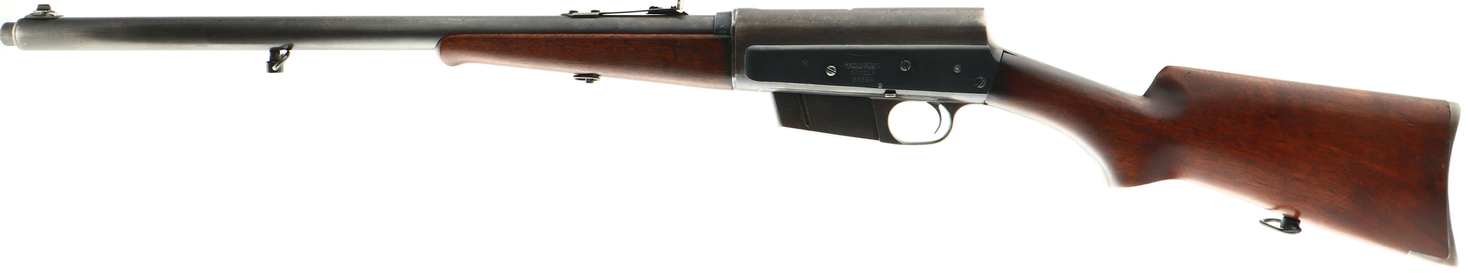 Remington, Model 8, 30 REM CAL, MFG. 1928, SN 56684, Semi-Auto Rifle, 22'' barrel. Straight grip stock are most often found in the early & mid production years, with the round knob becoming more in vogue in the 1910-20's & finally the flat knobs becoming more popular in the late 20's & early 30's. This example is from the late 20's. The original flat knob pistol gripped stocks are excellent stocks. There are very few minor scratches & contusions to the original finish, with some thinning at the belly of the stock & carry points. There are small missing chips in 3 of the 4 corners of where the stock wrist meets the receiver. The original metal blue finish rates 70% overall, with the finish toning a bit gray/plum as it thins, mostly on the receiver. The barrel is fitted with standard ajustable rear & a Lyman front blade sight. Bore is excellent, very bright & clean. Stock carries the popular serrated, bottom tang Remington crescent metal buttplate. 5 rd fixed magazine. Sling loops in the stock & barrel. A high quality rifle, with the popular flat knob stock. FFL or C&R Req. - Value: 700 to 1200