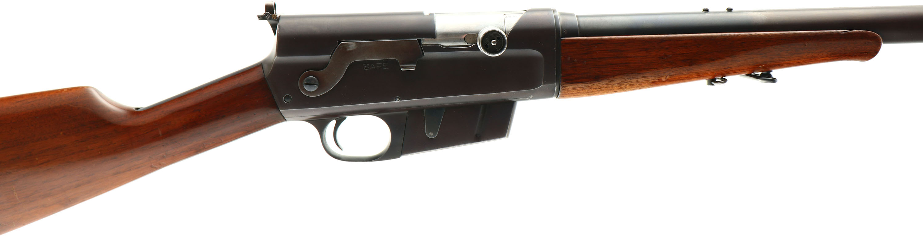 Remington, Model 8, .35 Rem Cal, MFG. 1936, SN: 69908, Semi-Auto Rifle, 22'' barrel. As a 1936 rifle, it is a last year of production example & one of the last & highest encountered SN's. The straight grip & schnabel forend stocks are very good & soild. There are numerous minor to small handling, nicks, scrapes & contusions to the original finish, which has some flaking & thinning at the carry points. The stock carries a Red Head ventilated recoil pad, which required the stock to be straight cut & a small filler piece of wood to fill the void from the lower tang of the old buttplate. The original metal blue finish rates 60% overall, but like most mid to late 1930's rifles, the blue is toning plum as it thins. Bore is excellent. The rifle carries a Lyman 41 side mounted receiver sight, while the barrel carries two filler screws in the rear provisions & a standard blade front sight. 4 round fixed magazine. Tight action. The stock & forearm carry sling loops. A well set up hunting rifle in the popular hunting 35 caliber. FFL or C&R Req. - Value: 400 to 750