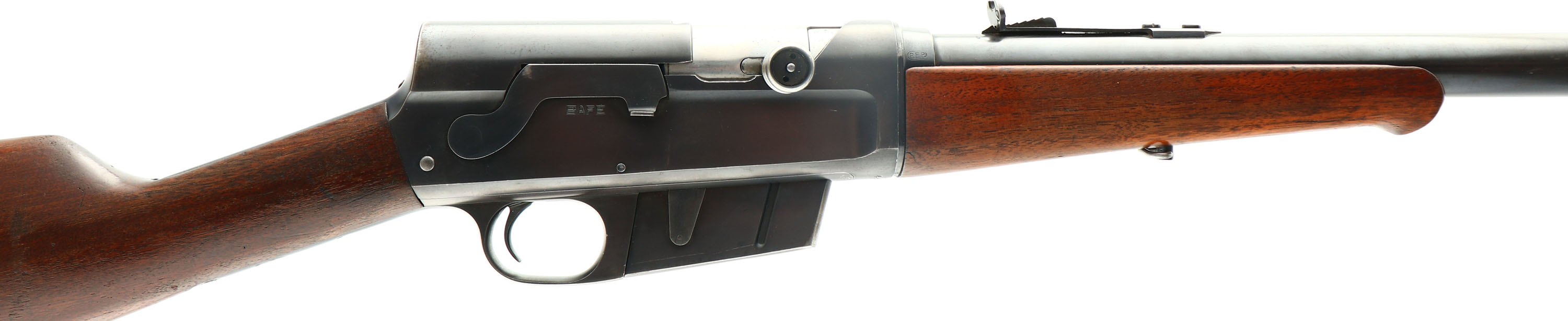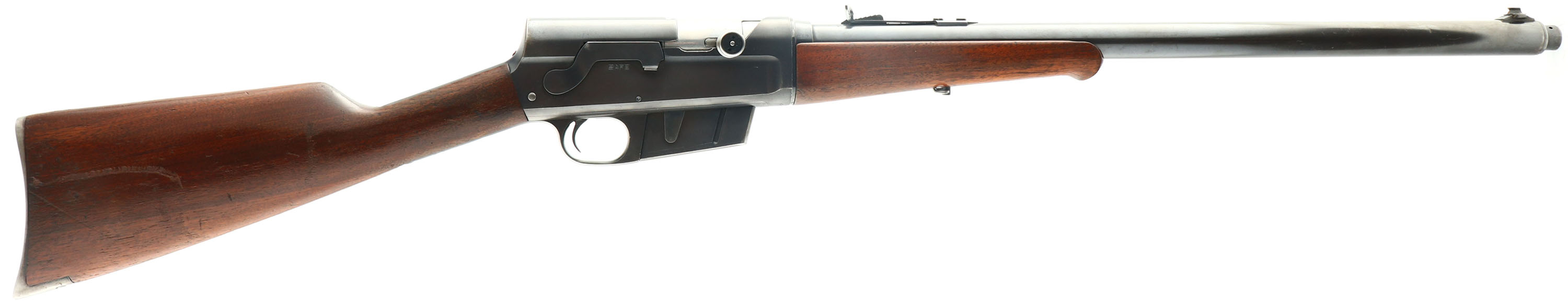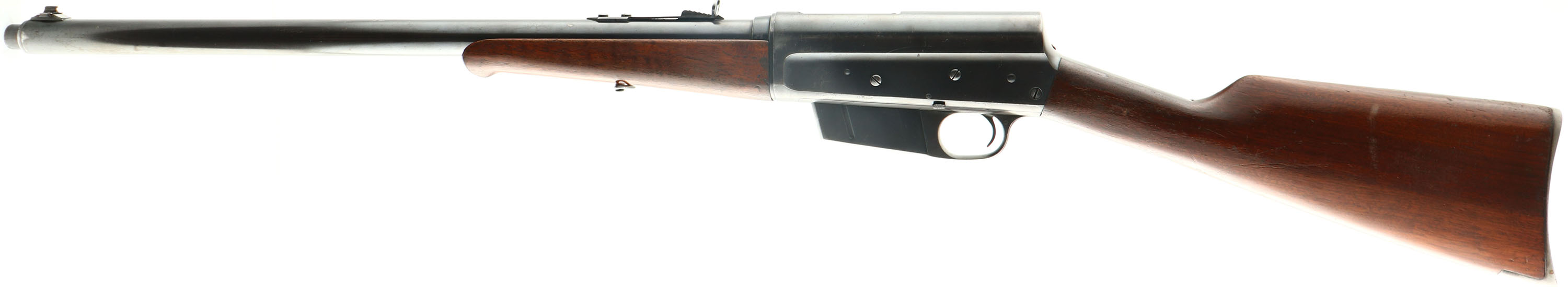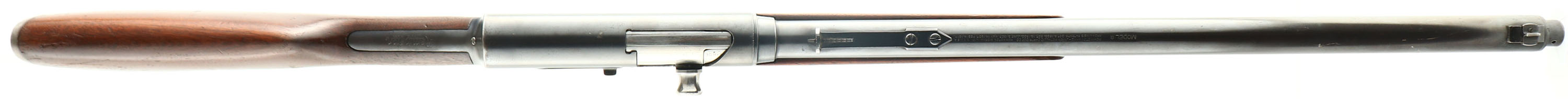 Remington, Model 8, .30 Rem Cal, MFG. 1923, SN: 48500, Semi-Auto Rifle, 22'' barrel. The original straight grip & schnabel forend stocks are excellent, with both carrying the original finish. There are several minor to small scuffs, scratches & contusions to the wood & finish, with thinning of the finish on the belly of forend & the wrist. There is a larger 4'' scrape on the right side of the stock. The original metal blue finish rates 70% overall. Bore is excellent. The barrel carries an adjustable rear sight & a blade front sight. Stock carries the popular bottom tang crescent metal buttplate. 5 round fixed magazine. Tight action. A very nice overall & original rifle. FFL or C&R Req. - Value: 700 to 1000