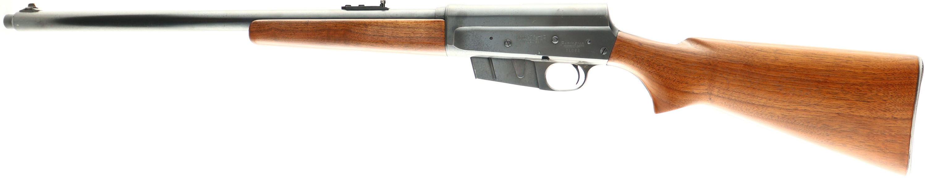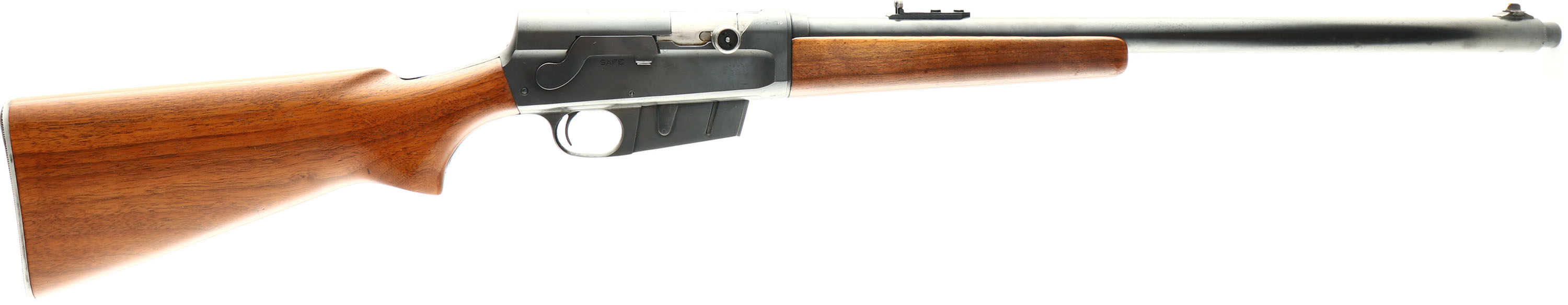 Remington, Model 81, 35 REM CAL, MFG. 1950, SN: 51082, Semi-Auto Rifle, 22'' barrel. The original flat pistol grip wood stocks are excellent, having been lightly sanded & very nicely refinished. There are very few minor handling marks or light & contusions remaining. The metal is slightly proud to the wood in the area of the wrist. The original metal blue finish rates 85% overall, but with loss due to speckled haze throughout. The barrel carries a Marble's folding rear rear & ivory bead front blade sights. Bore is excellent. Stock carries the Remington checkered metal buttplate. 4 rd fixed magazine. An excellent presenting standard 81 rifle. FFL or C&R Req. - Value: 600 to 1200